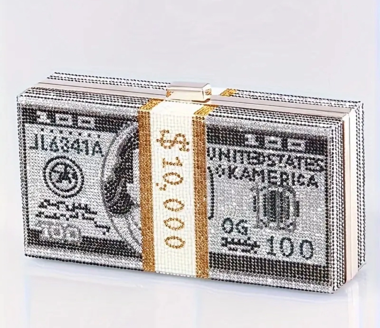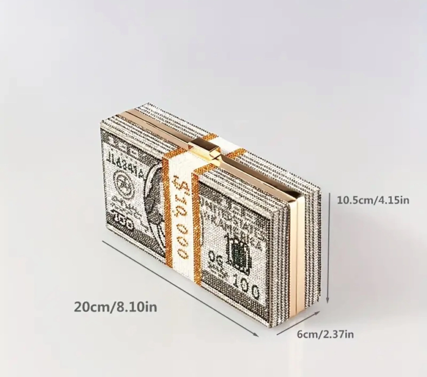 Stunning rhinestone clutch purse. Features a unique money stack design. Gold-toned hardware and chain strap. Perfect for evenings out.