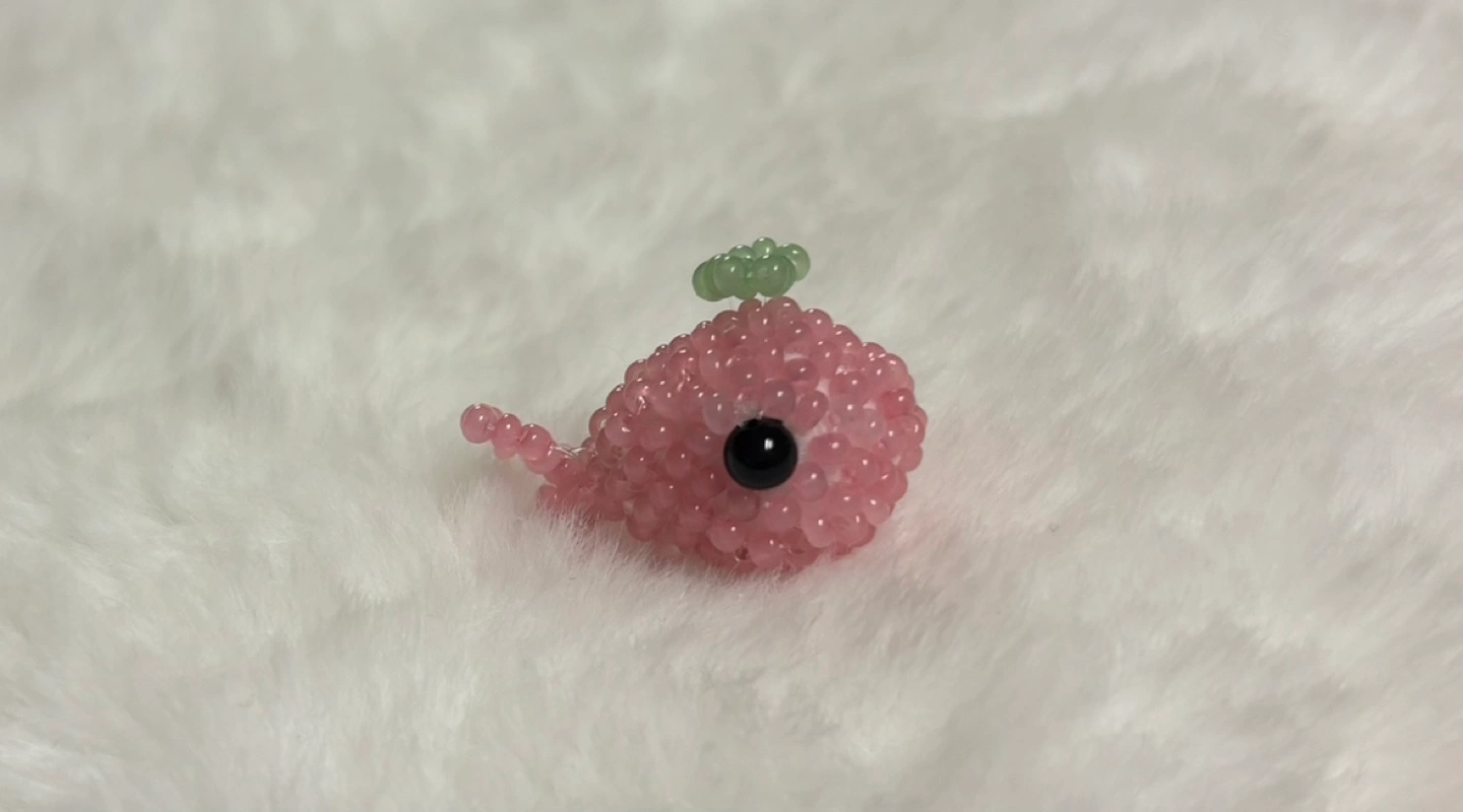 Pink beaded whale. Small and cute. Perfect for a keychain or decoration. Features a small green beaded top.
