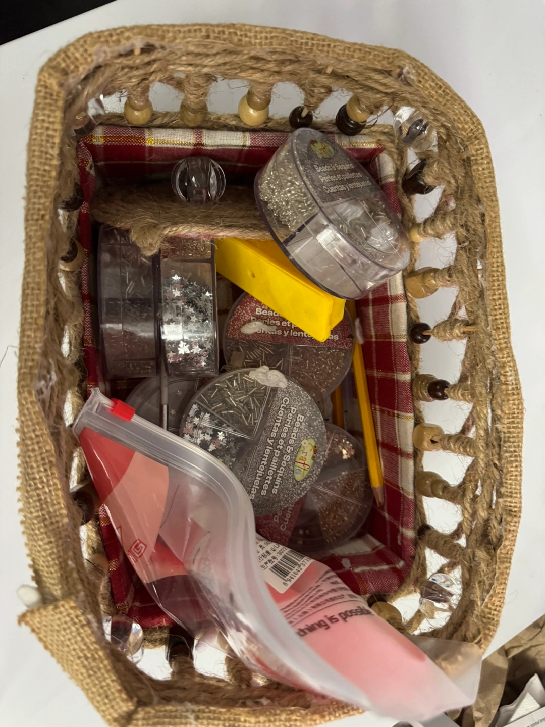 Burlap basket filled with various crafting supplies. Includes multiple containers of beads, sequins, and other embellishments. Includes other random knickknacks