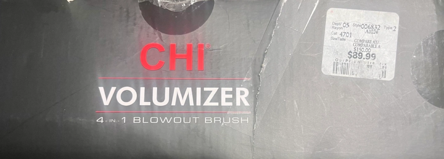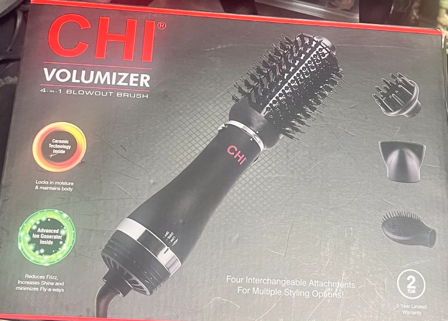 New CHI Volumizer 4-in-1 blowout brush. Four interchangeable attachments. Locks in moisture and maintains body. Reduces frizz, increases shine and minimizes fly-aways. Ceramic technology and advanced ion generator inside.
