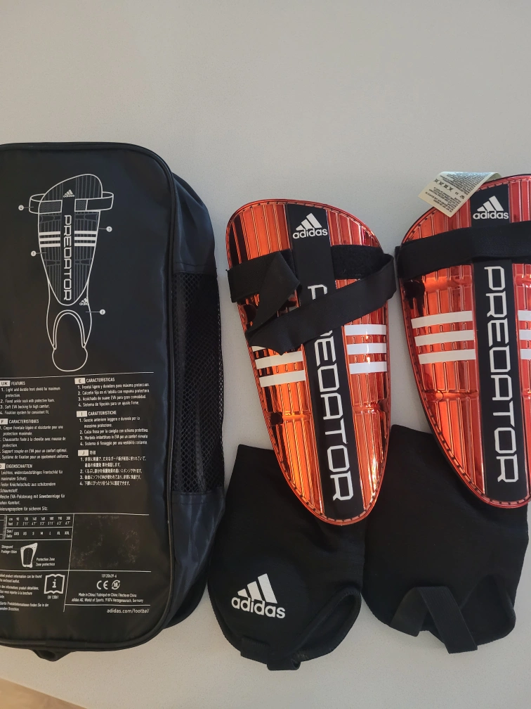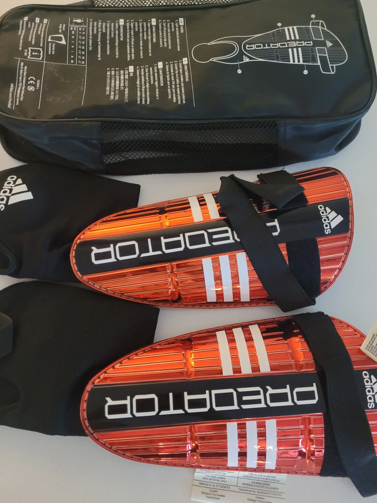 Red Adidas Predator shin guards. Includes carry bag. Excellent condition.
