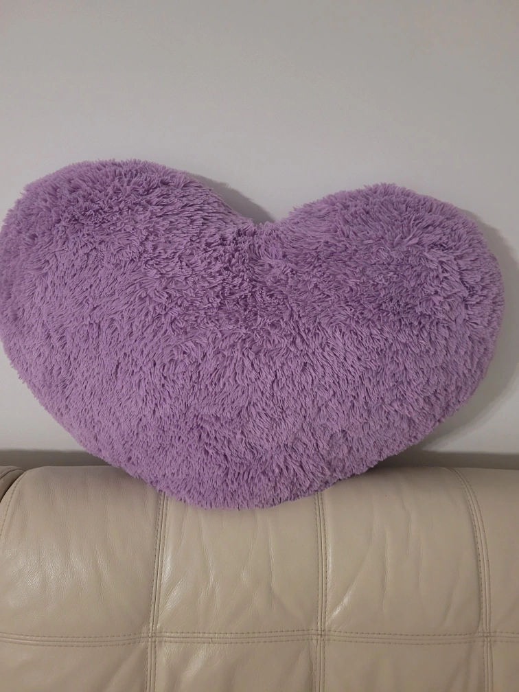Fluffy purple heart-shaped pillow. Soft and cuddly. Perfect for Valentine's Day or adding a touch of romance to your decor. Great for cuddling.