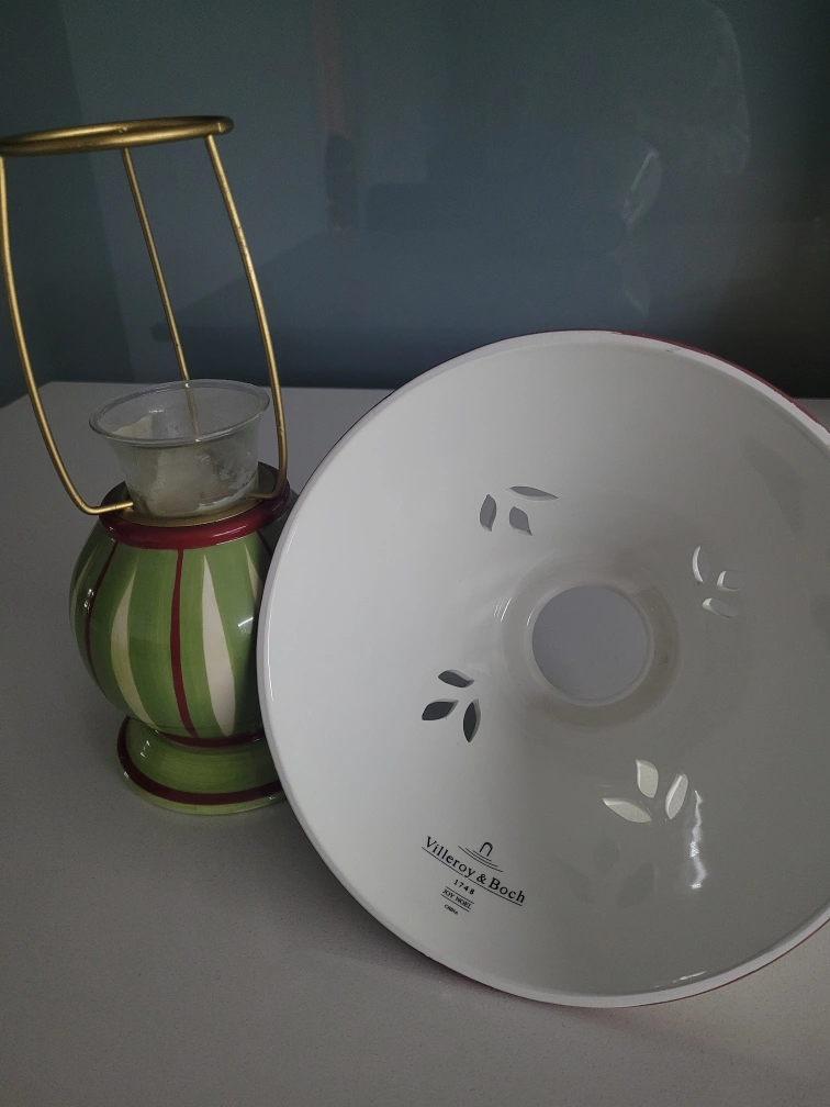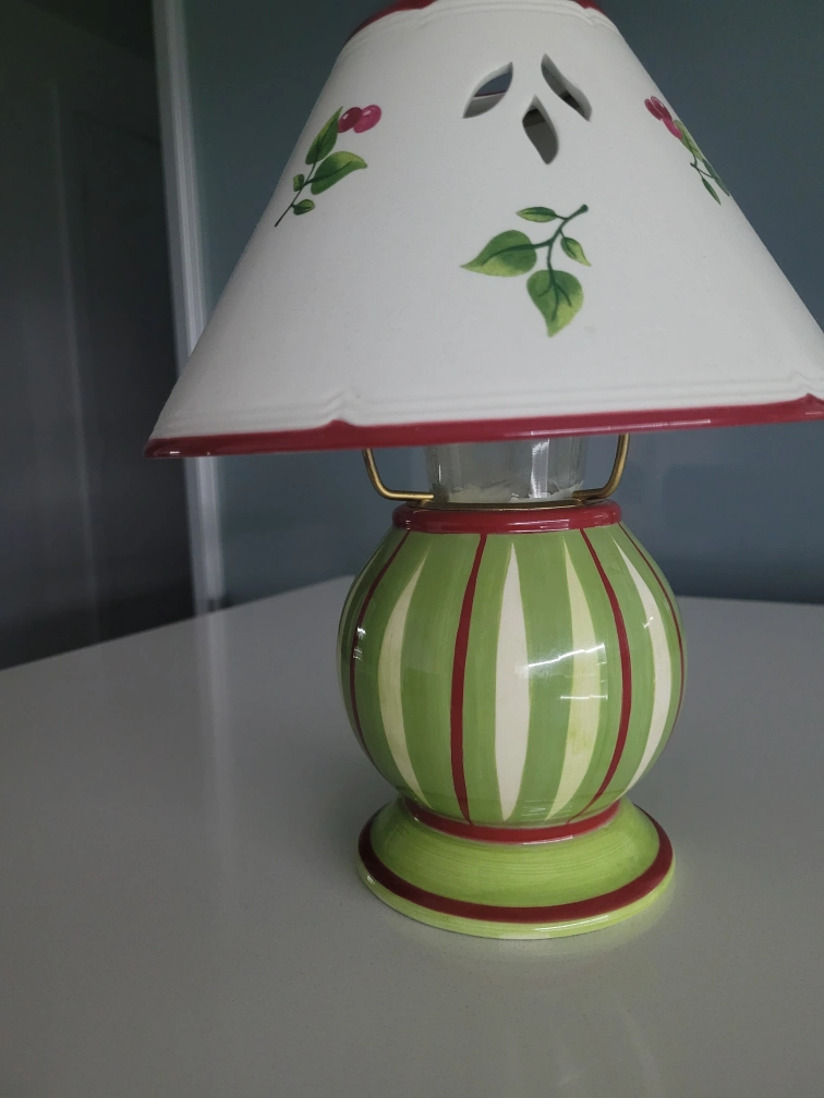 Charming ceramic candle lantern. Green and red striped base. White shade with leaf and cherry accents. Gold-toned metal frame. Excellent condition.