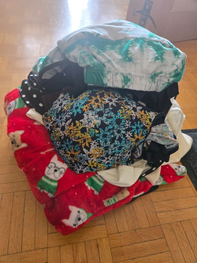 Small lot of women's size xl-3x clothing items. Bras, track pants, tops and pajama pants and more