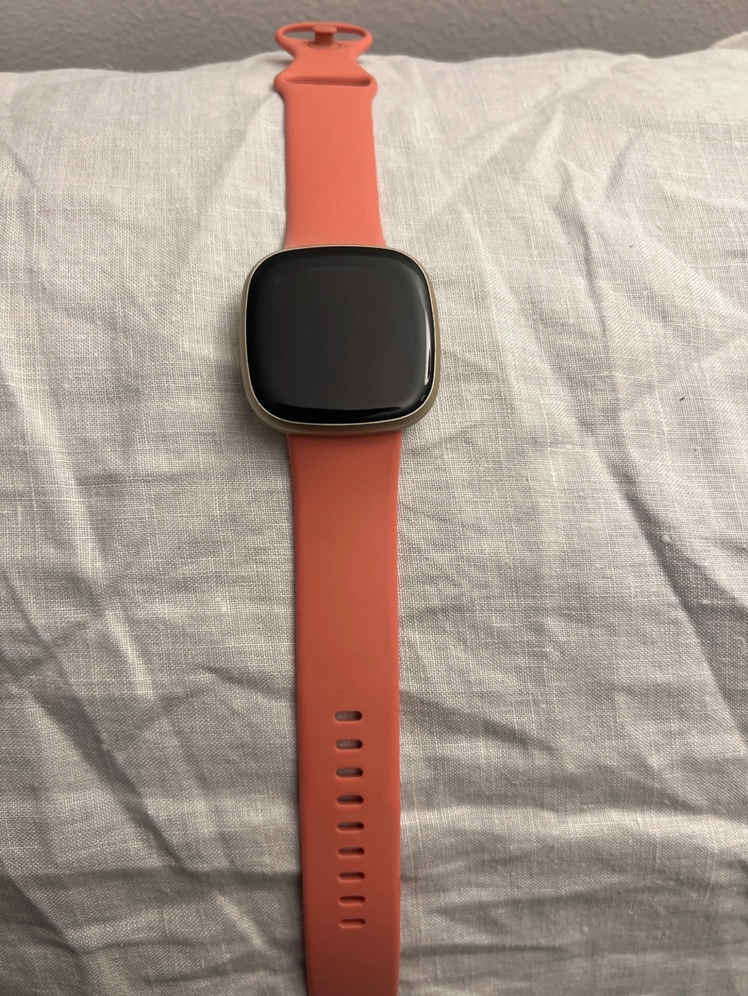Smartwatch features a gold-toned bezel and coral silicone band. Pre-owned, good condition. Includes a unique band loop.