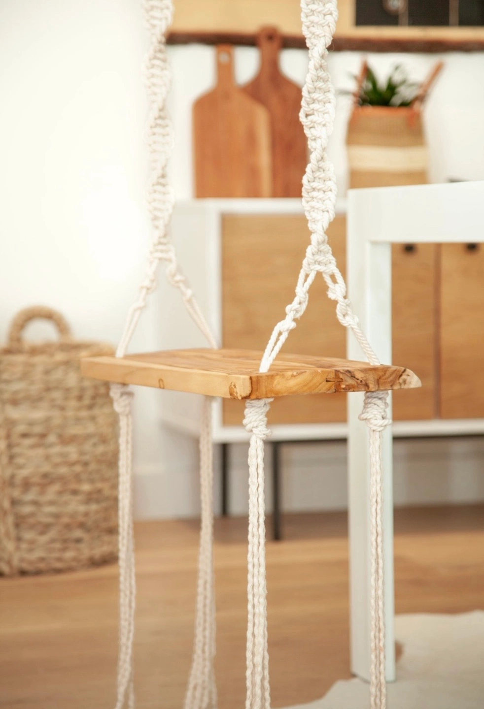 Unique indoor hanging swing. Wooden seat. Perfect for kids or a stylish addition to your home decor. Cream coloured cords. Comes with hooks and can hold up to 300 lbs