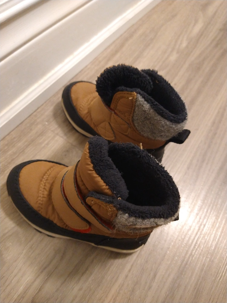 Pair of toddler's winter boots. Tan/brown colour with black soles and grey fleece lining. Velcro closure. Good for snow and cold weather.