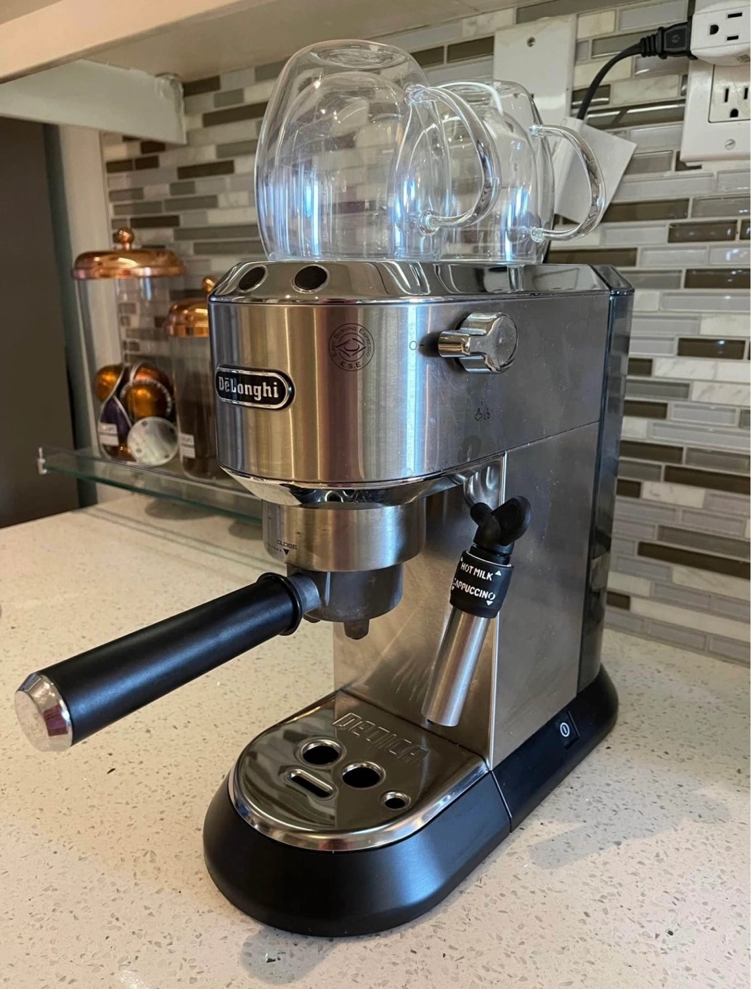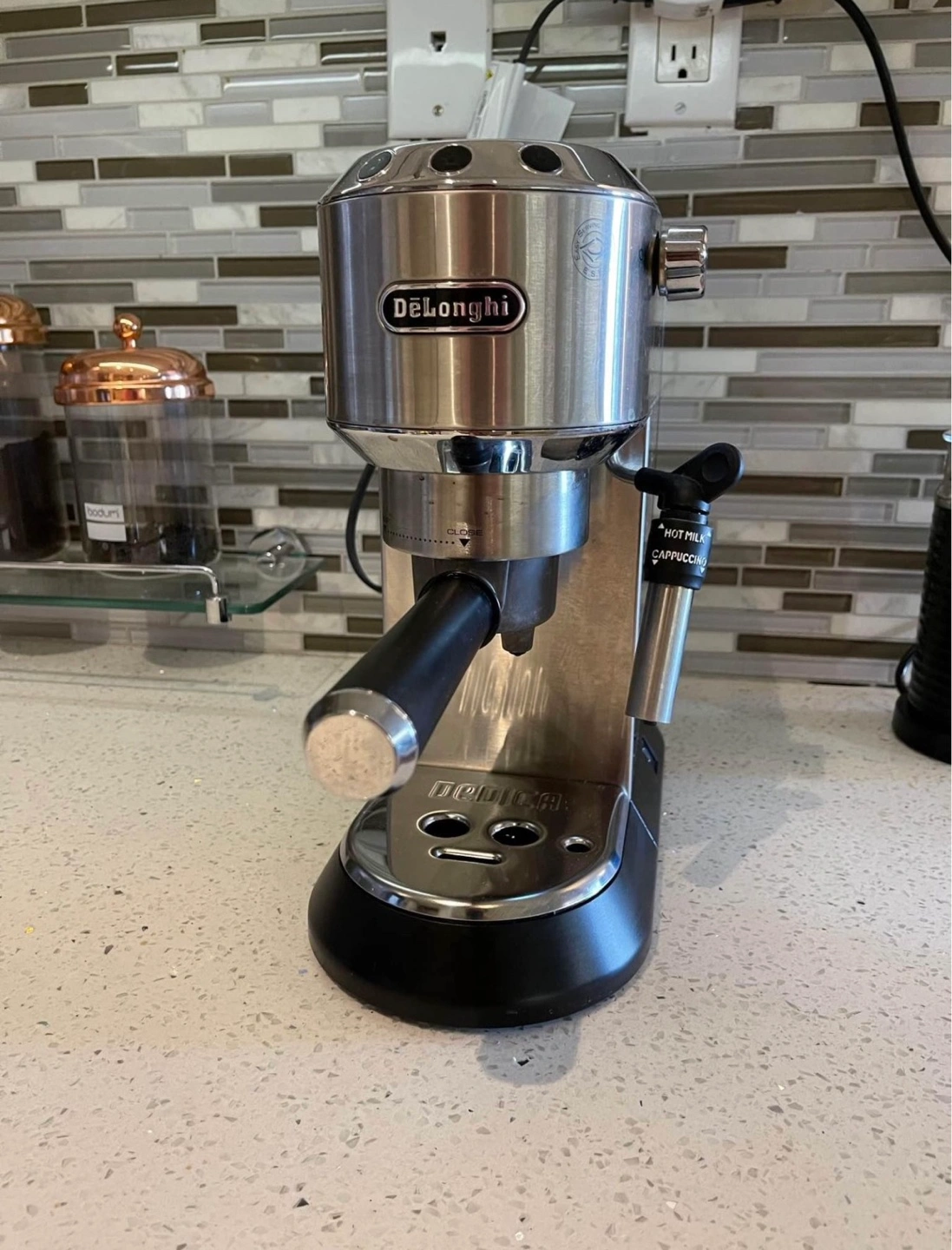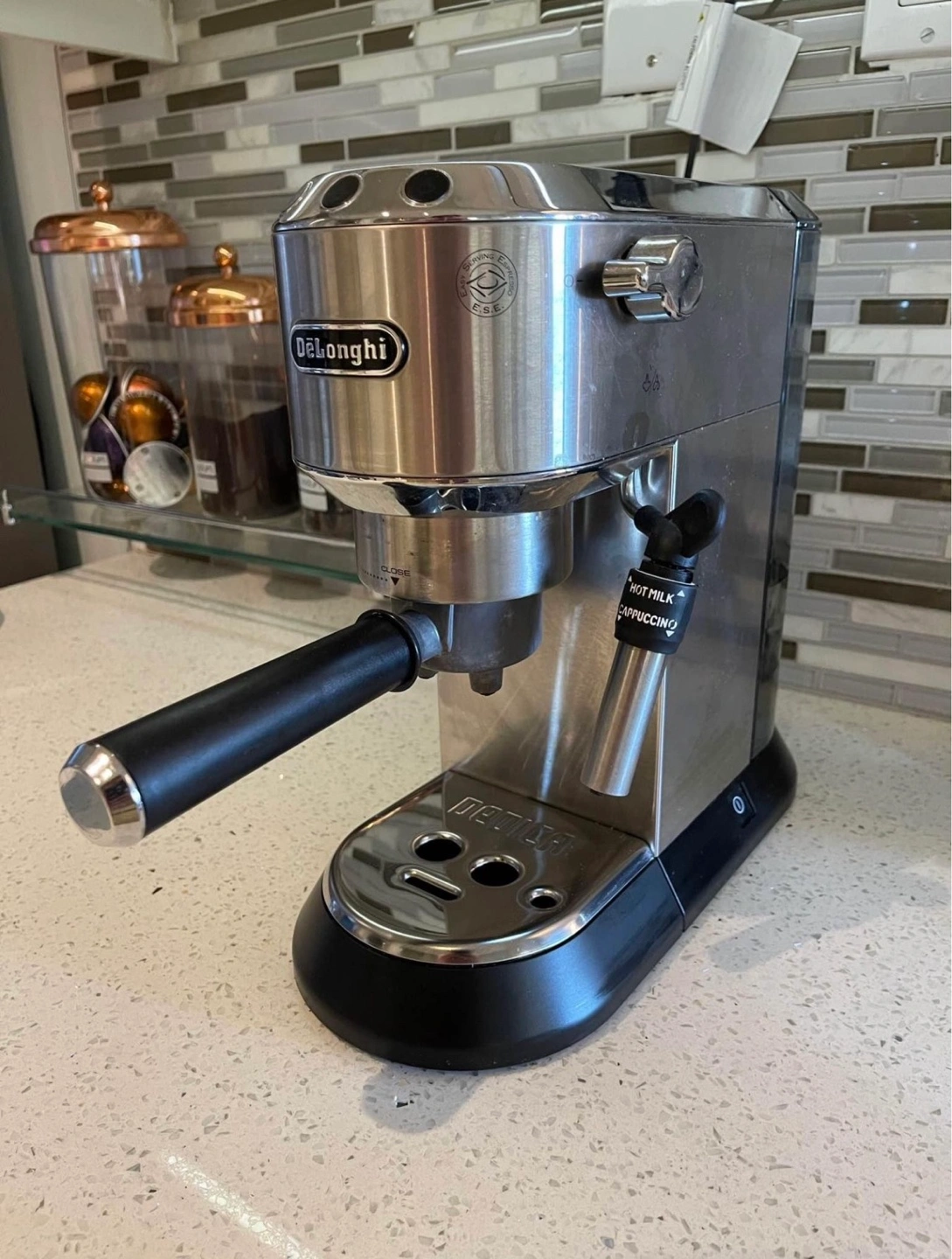 Stainless steel espresso machine. Makes espresso, cappuccino, and hot milk. Easy to use. Compact design. Excellent condition.