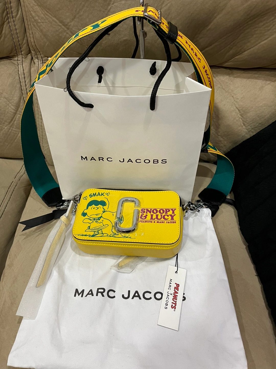 Yellow leather crossbody bag. Features Snoopy and Lucy Peanuts characters. Adjustable strap. Comes with dust bag and original Marc Jacobs shopping bag.