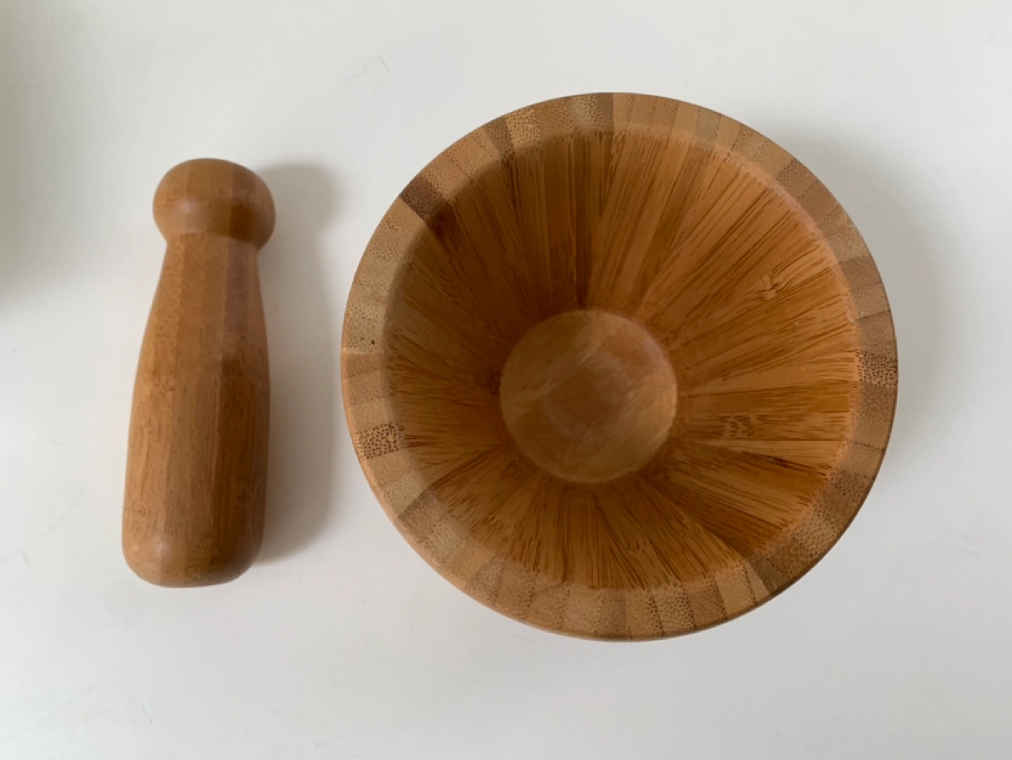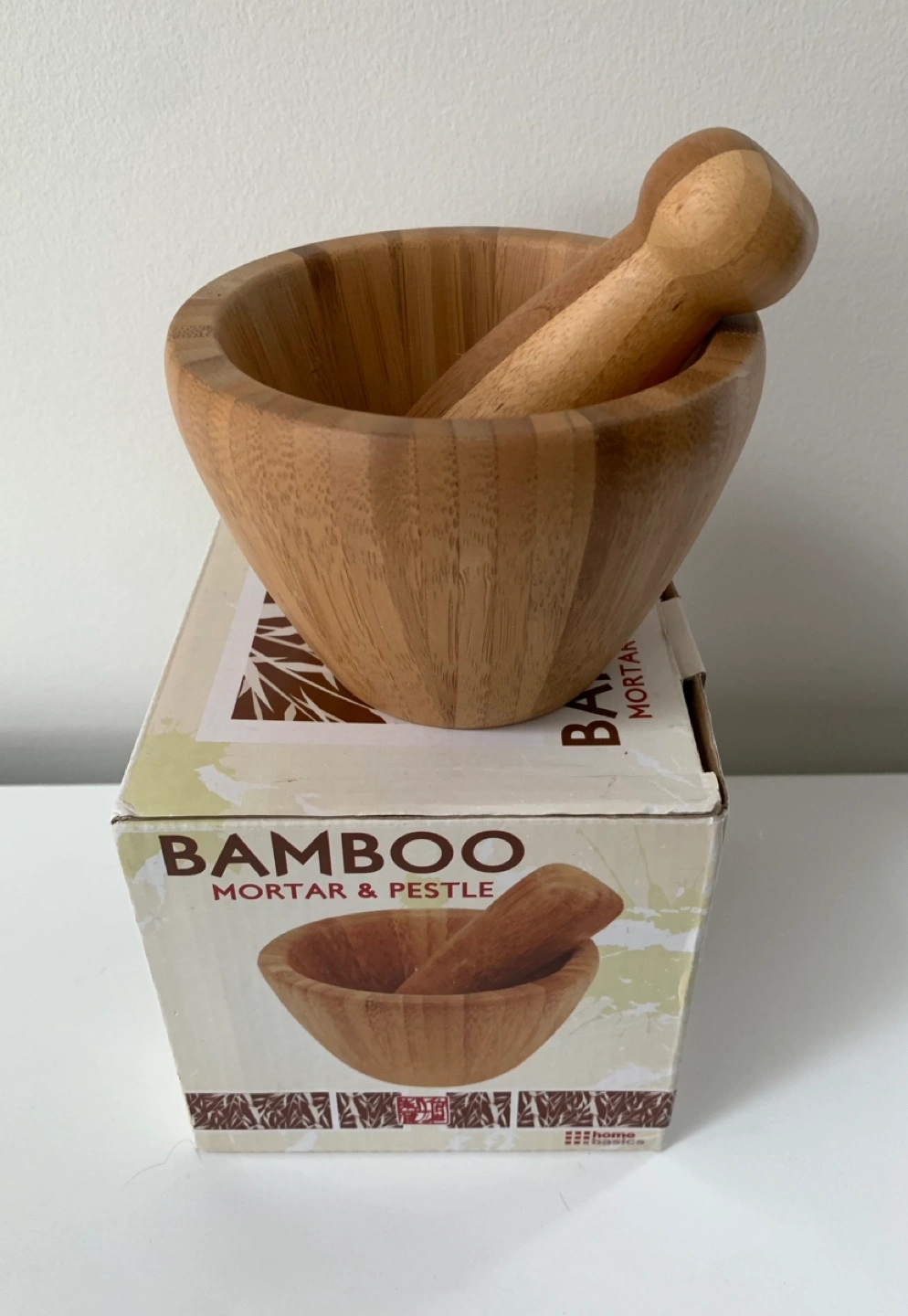 511Bamboo Mortar & Pestle for your kitchen. Condition is new and comes in a box. Was sitting in my moms storage unit for years.