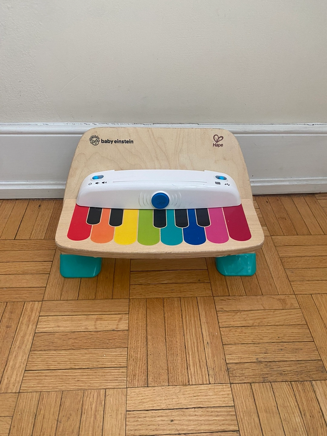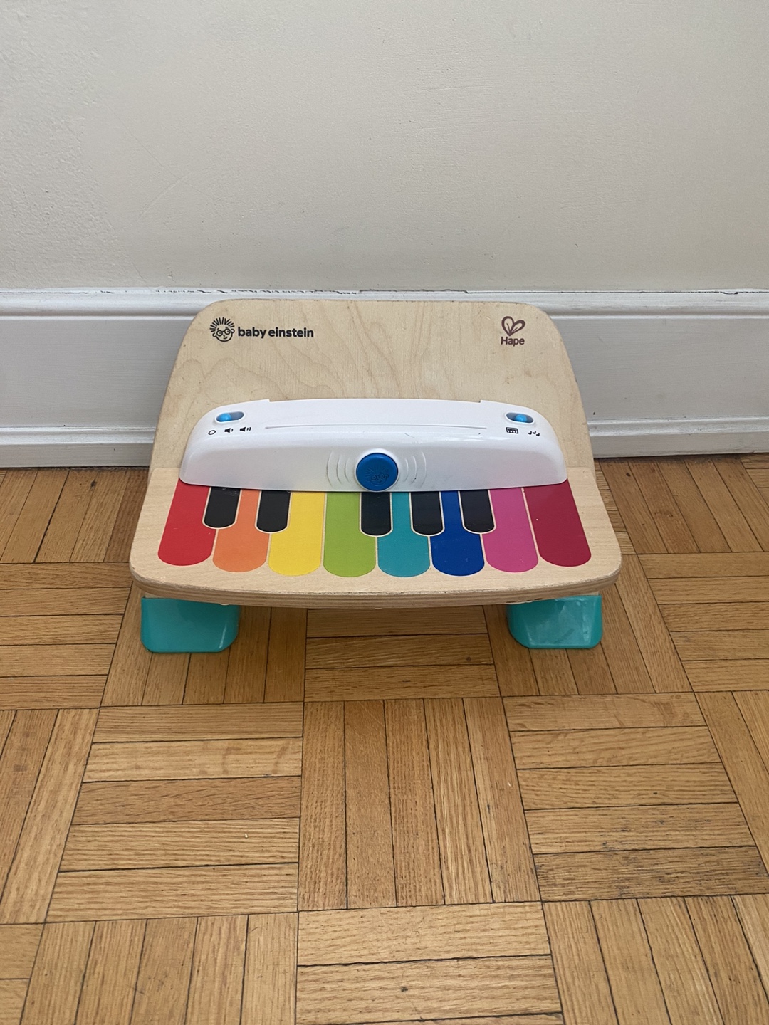 Wooden baby piano. Features colourful keys and light-up buttons. Great for little ones. Includes stands for easy playing.