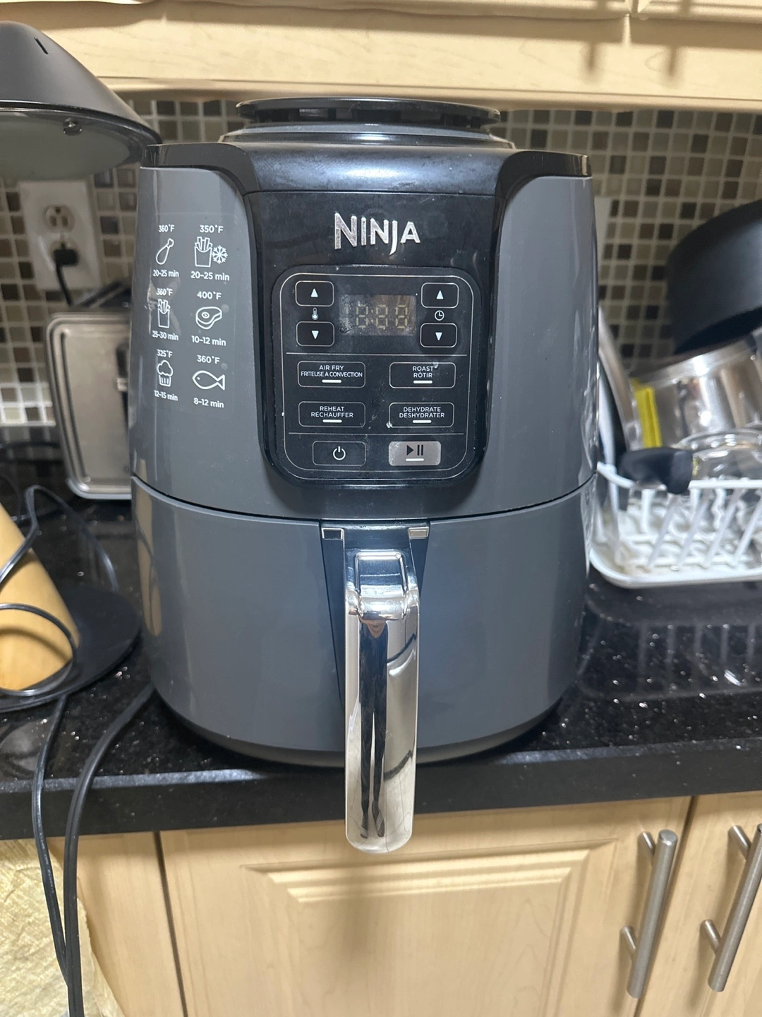 Digital air fryer. Multiple functions: air fry, roast, reheat, dehydrate. Features a digital display and easy-to-use controls.