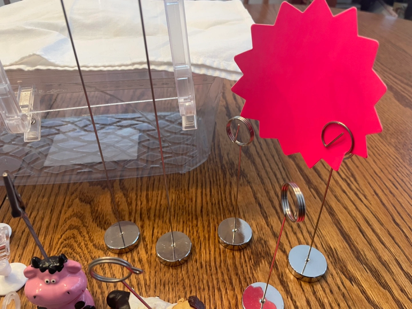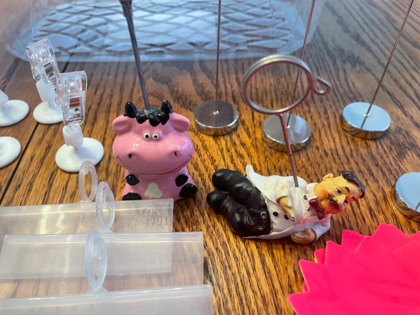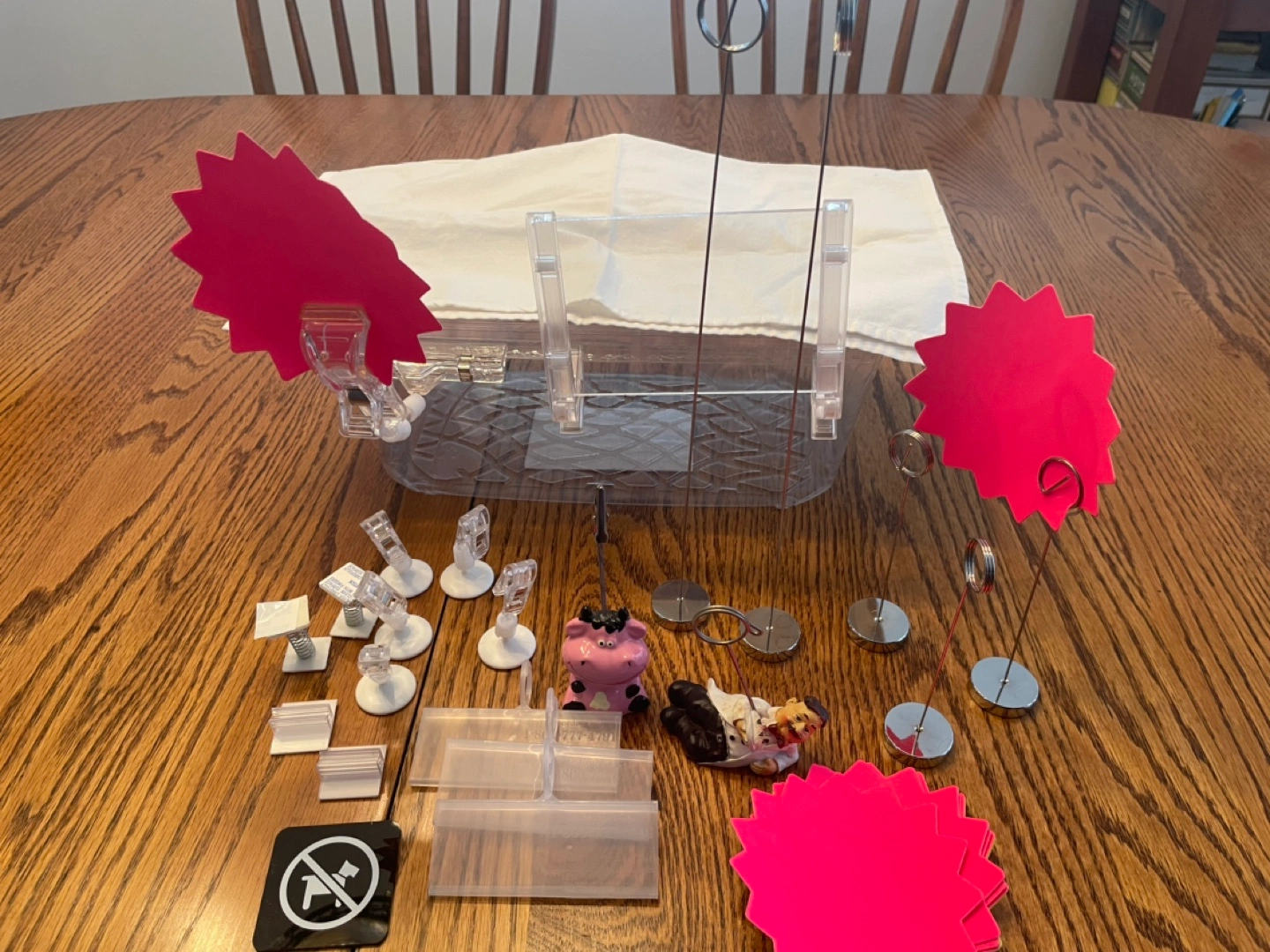 Various acrylic display stands, clips, and holders. Includes small and large stands, clips with adhesive bases, and several price tag holders. Also includes a no dogs allowed sign and some pink cow figurine. Great for craft shows or retail displays.