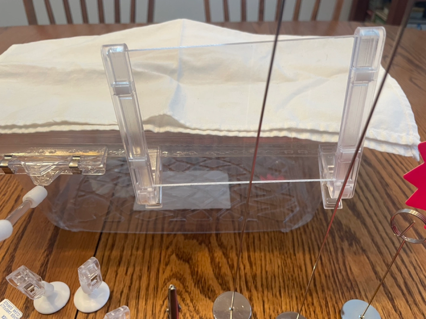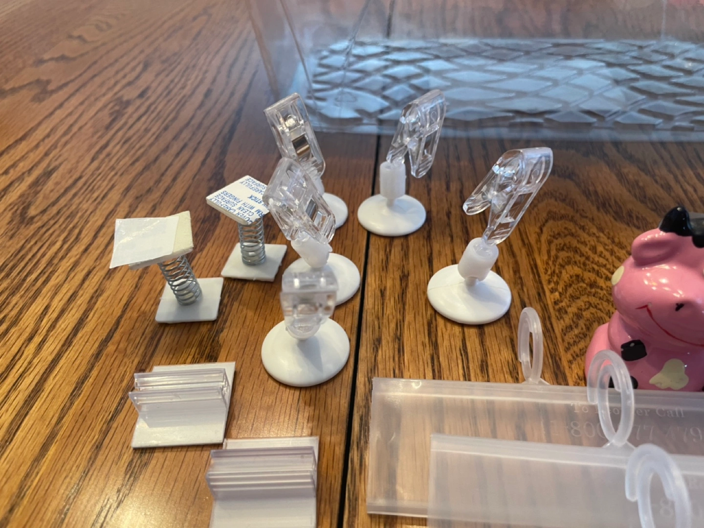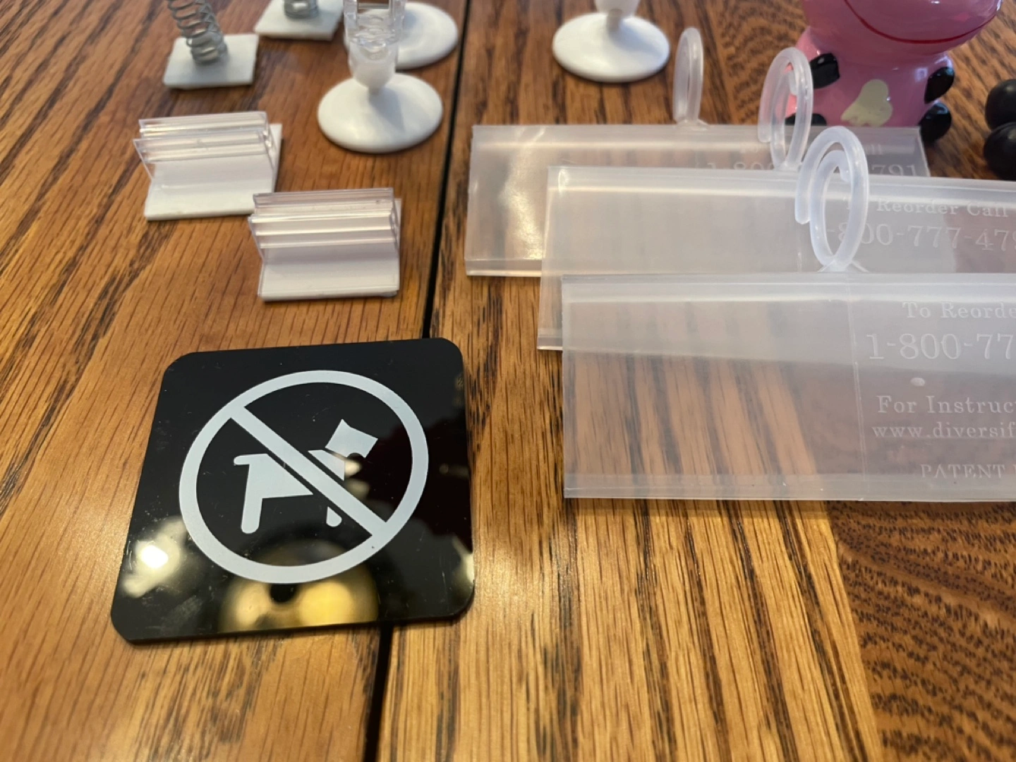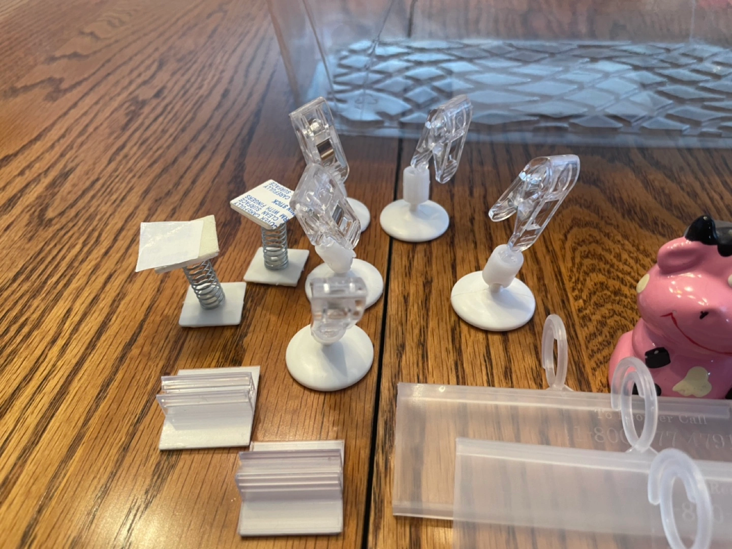 Various acrylic display stands, clips, and holders. Includes small and large stands, clips with adhesive bases, and several price tag holders. Also includes a no dogs allowed sign and some pink cow figurine. Great for craft shows or retail displays.