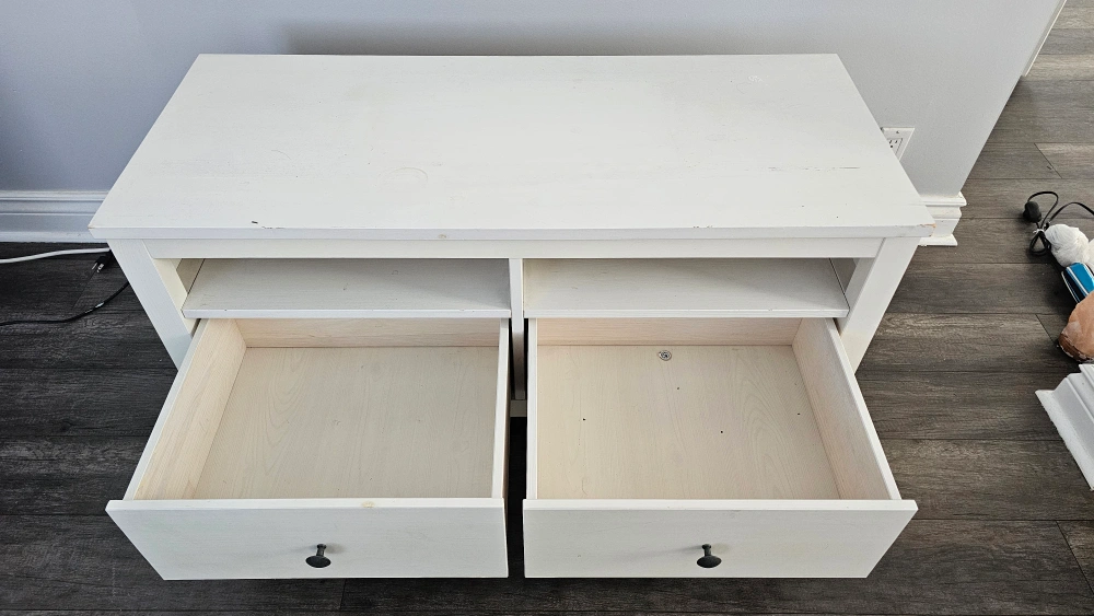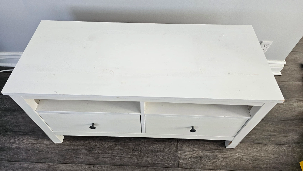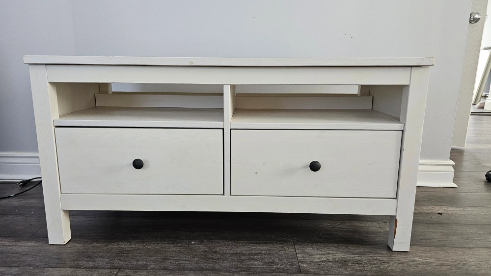 White wooden TV stand. Two drawers. Open shelving. Minor wear and tear. Sold with TV as a combo.