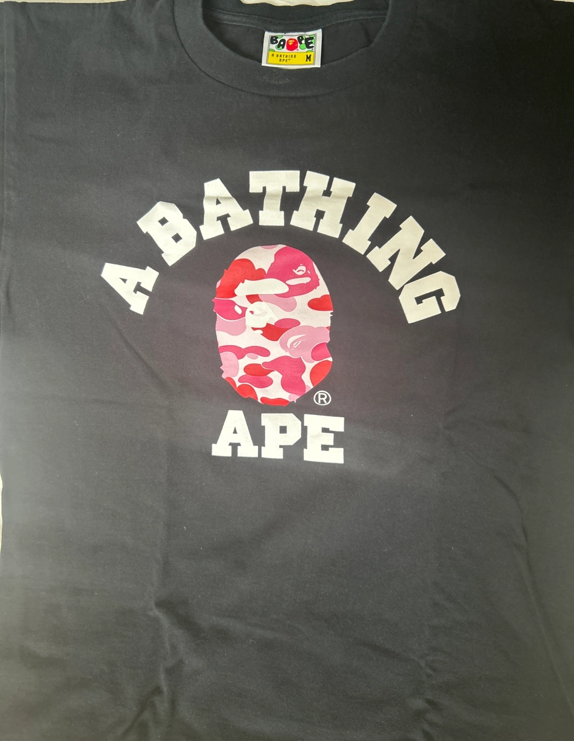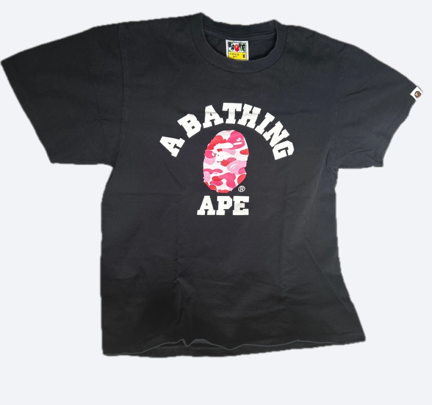 Black cotton t-shirt. Features a pink camo Ape head within an arc reading 'A Bathing Ape'. Classic BAPE branding. Worn once only. In great condition. Smoke/Pet free home. Cash/ Pick up only.