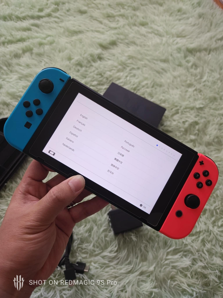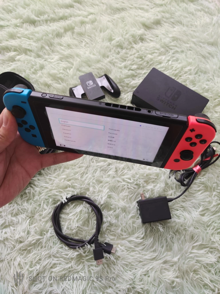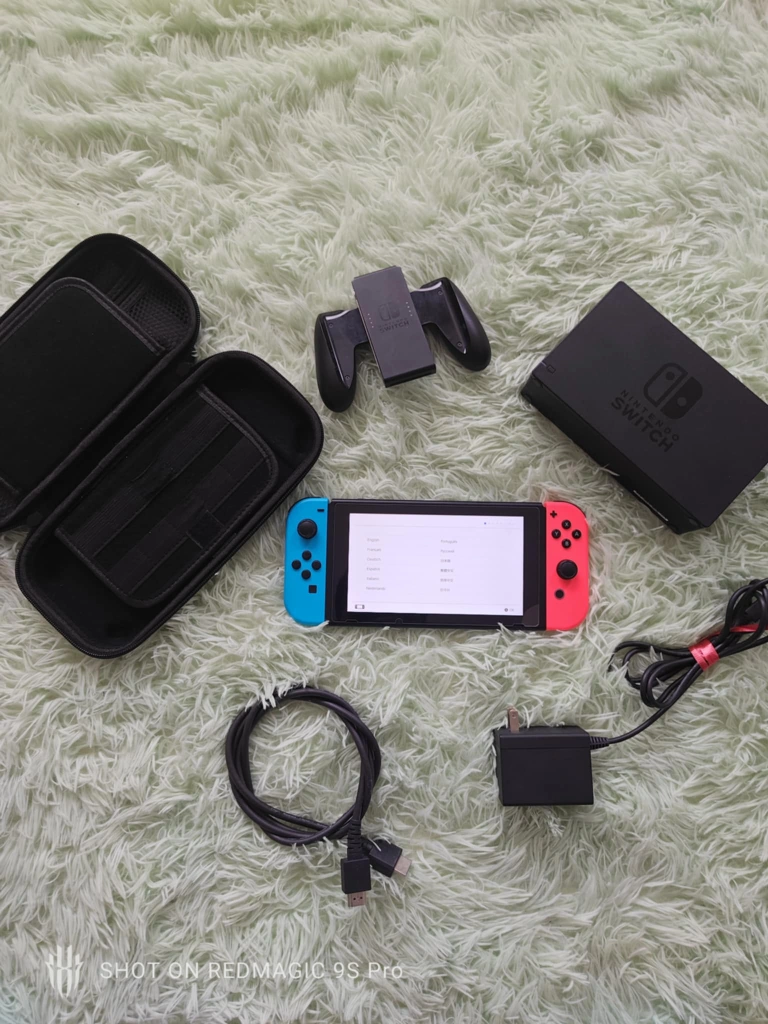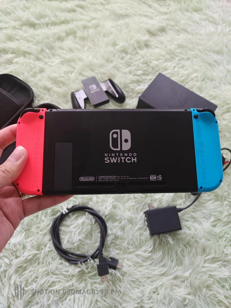 Pre-owned Nintendo Switch console. Neon red and blue Joy-Cons. Includes original dock, power adapter, HDMI cable, and carrying case. Screen protector installed. Ready to play!