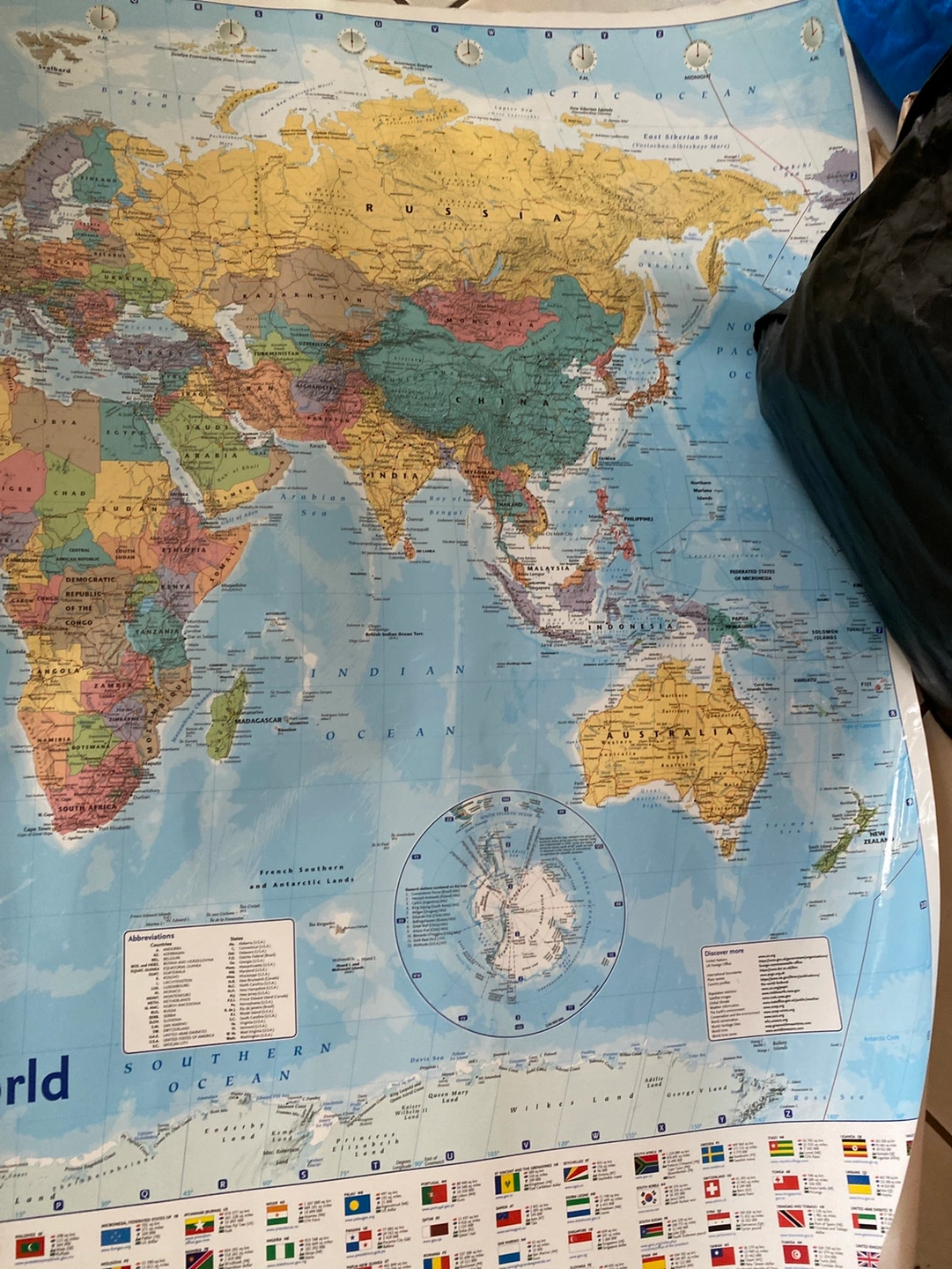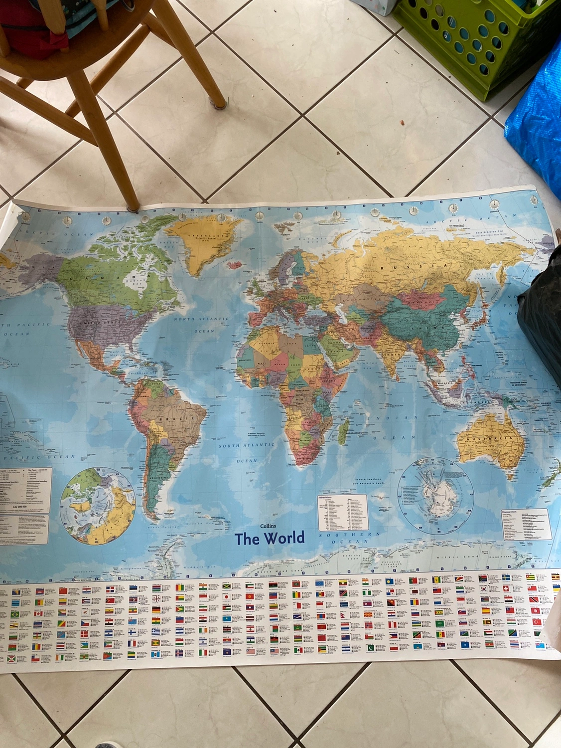 Large colourful world map. Shows countries, capitals, major cities, and oceans. Includes inset maps of the Arctic and Antarctic regions. Features flags of the world at the bottom. Excellent for classrooms or home use.