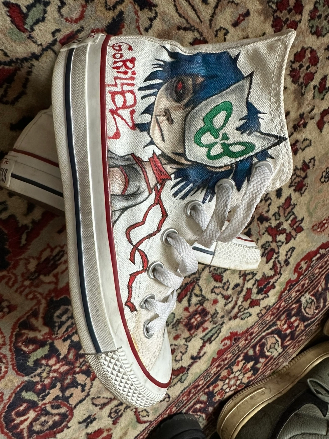 Hand Painted Gorillaz Converse Women’s size 6. Unsure who painted them, they are so cool but a half size too small. They have some stains but I’m sure they can spot clean up really nice. $20.