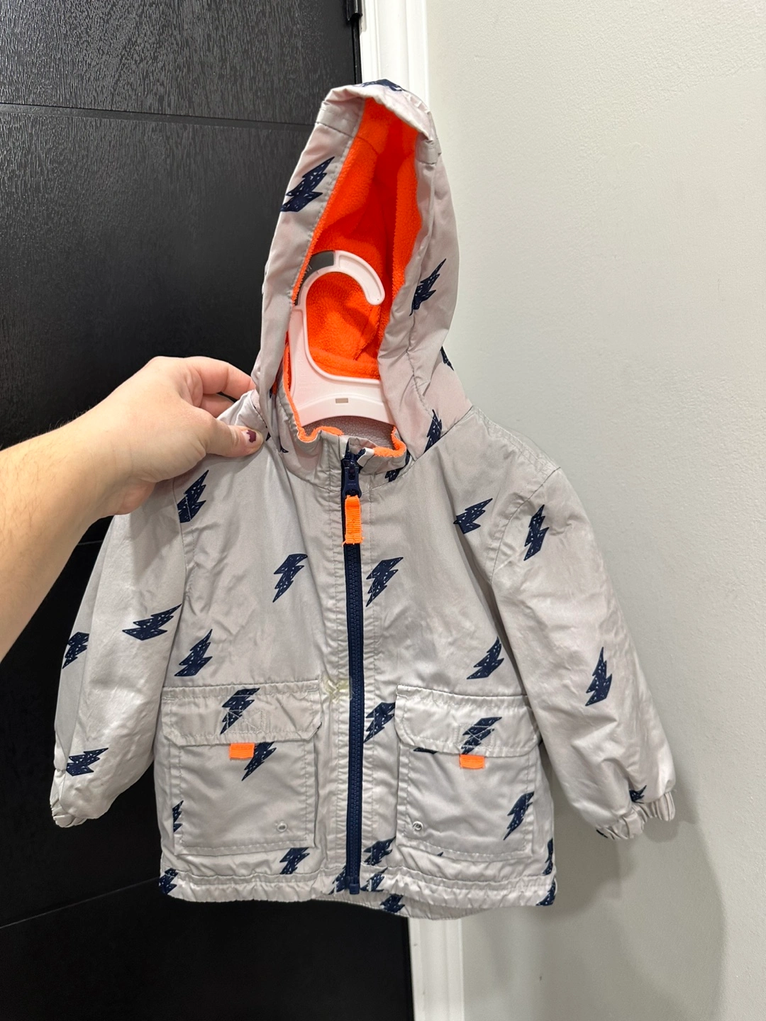 32Adorable baby boy's jacket. Grey with navy lightning bolt pattern. Features a zip-up front, orange lining in the hood, and two front pockets. Great for cooler weather.