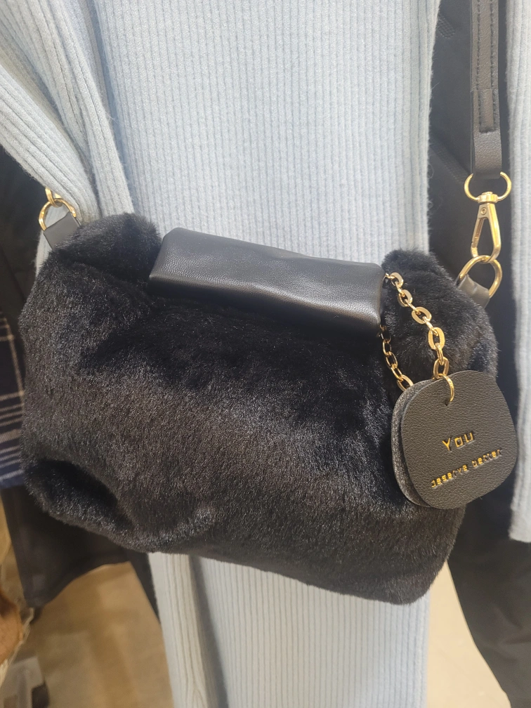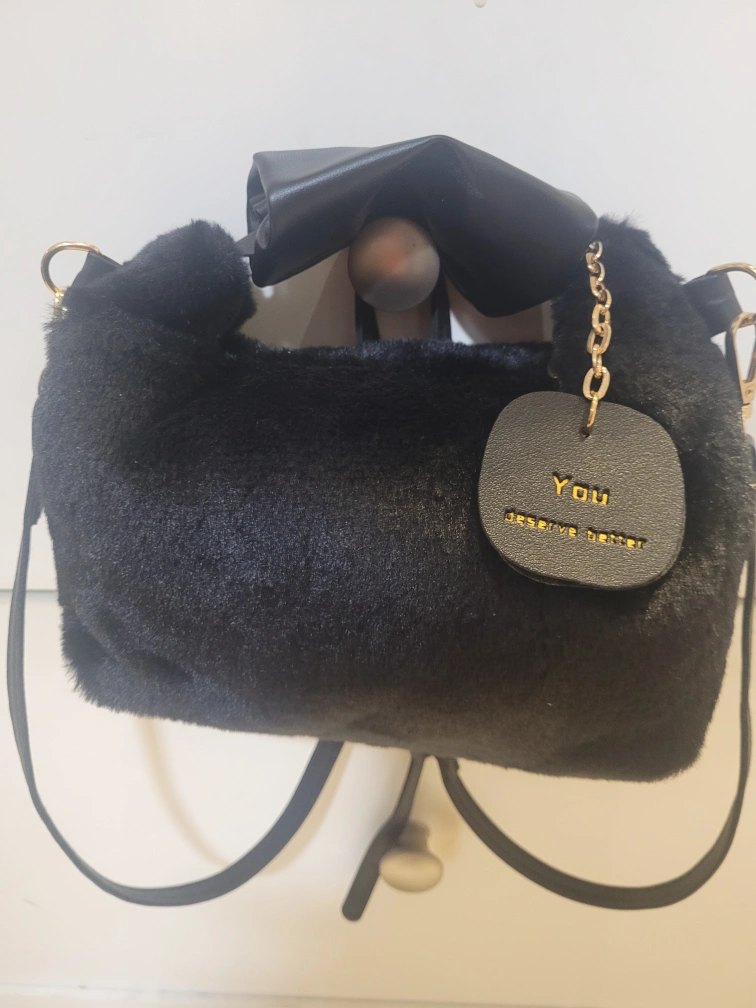 Adorable black faux fur crossbody bag. Features a small black leather flap and gold chain detail. Adjustable strap. Perfect for everyday use.