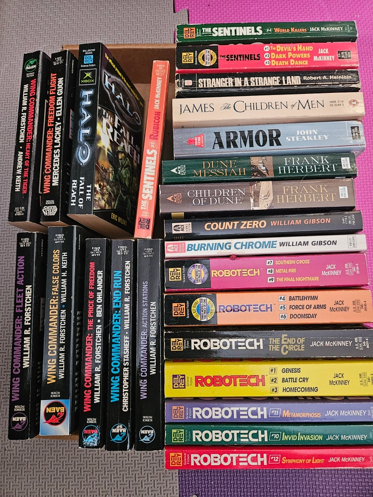 Large collection of paperback books. Many authors and titles represented. Includes several Wing Commander and Robotech novels. would like to sell as a lot. Willing to break up for $5 each.
