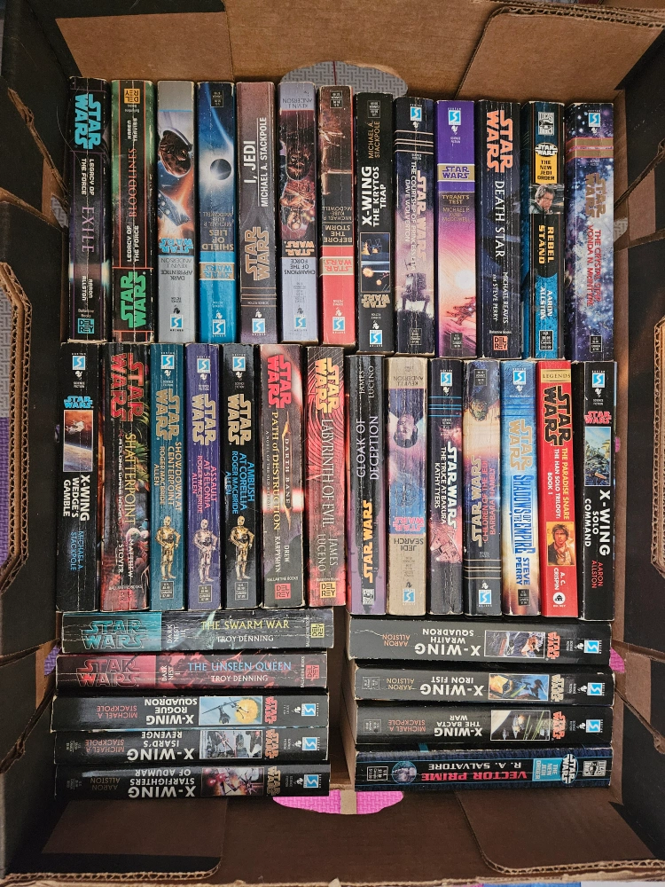 Large collection of Star Wars novels. Many different titles and authors. Mostly in good condition. Looking to sell as a lot. Open to reasonable offers.