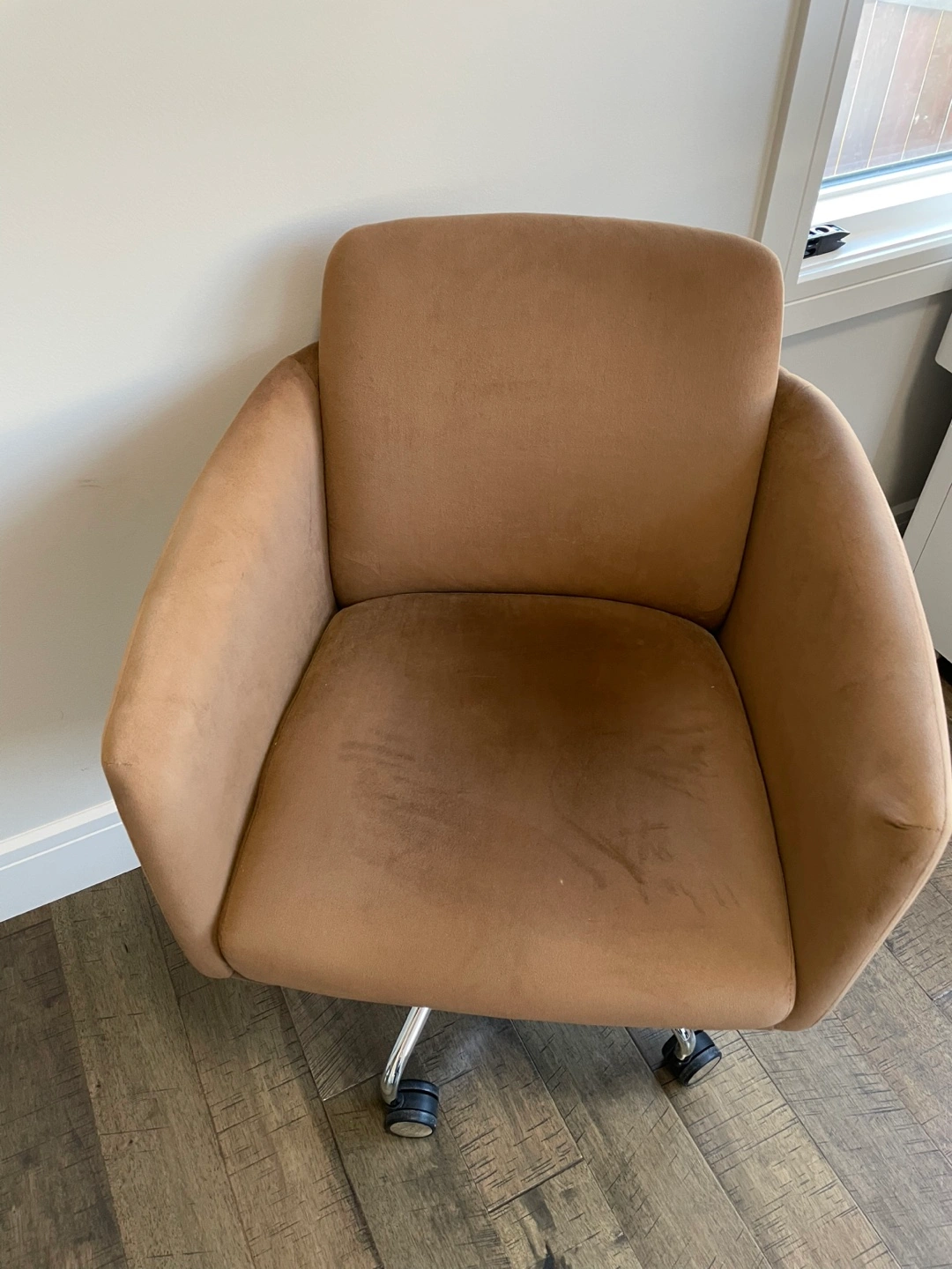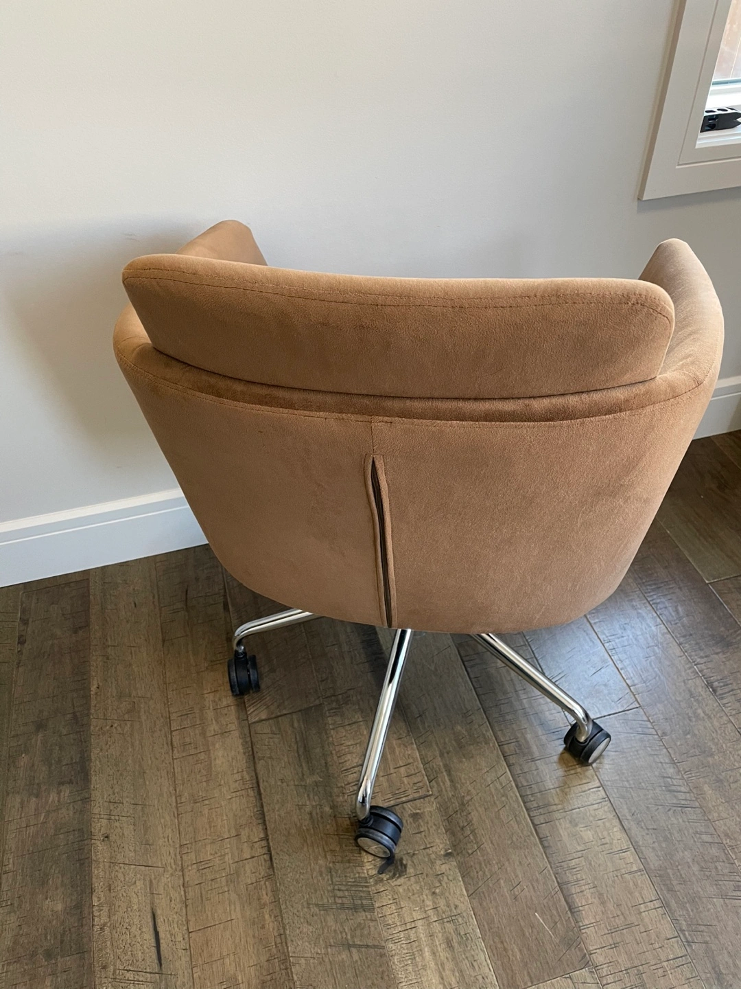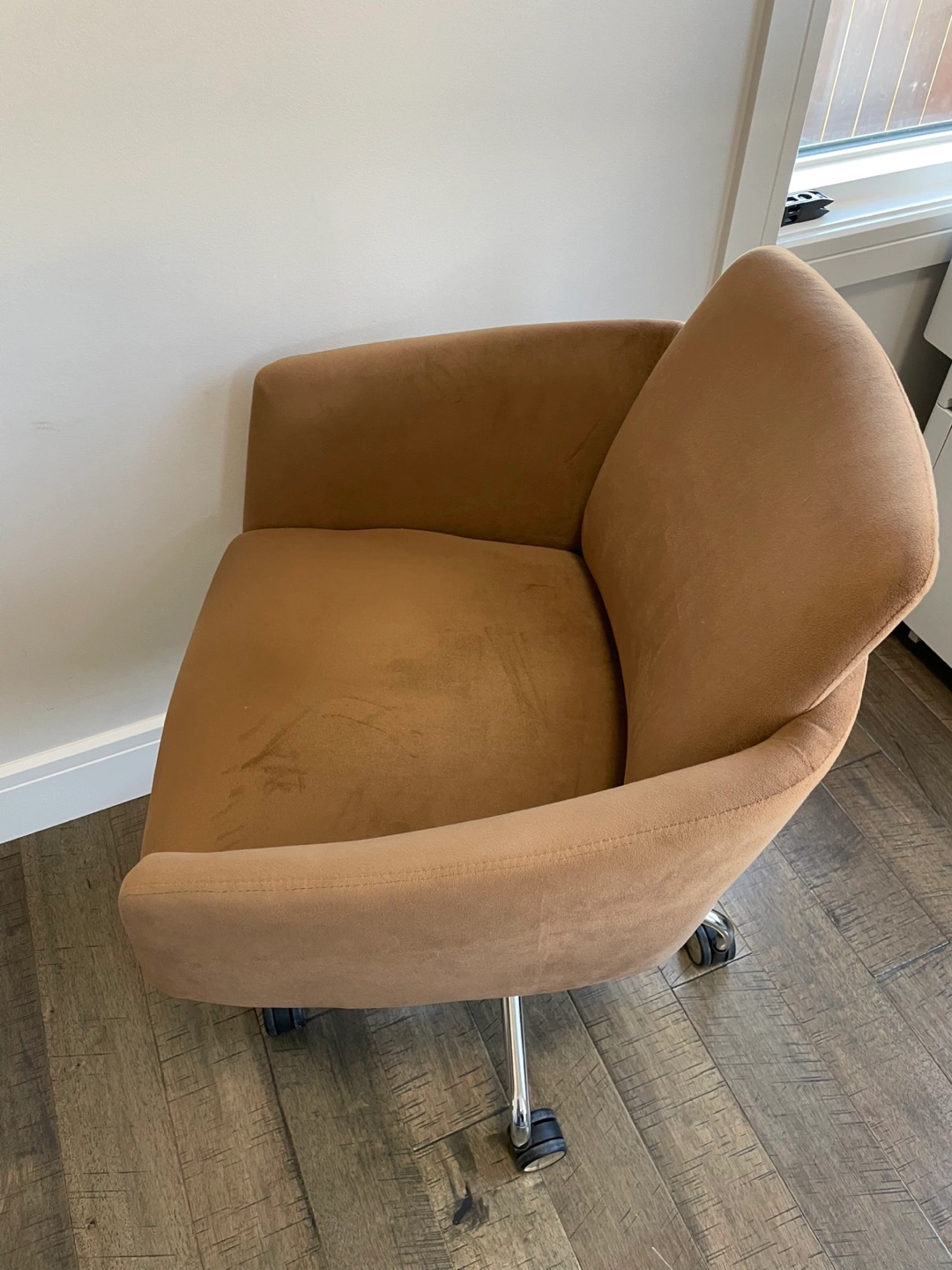 Comfortable brown fabric office chair. Chrome base and five casters. Good for home office or small workspace.