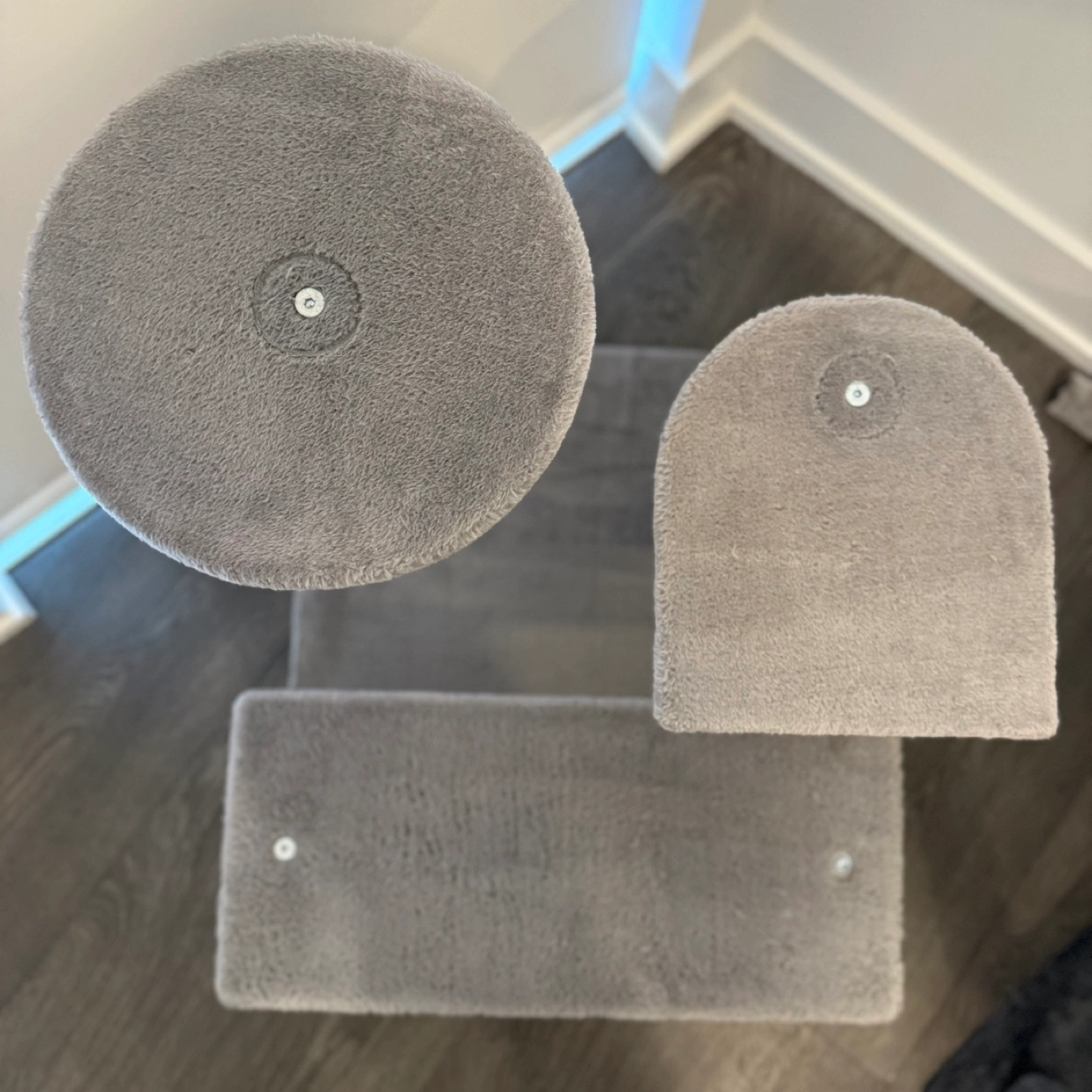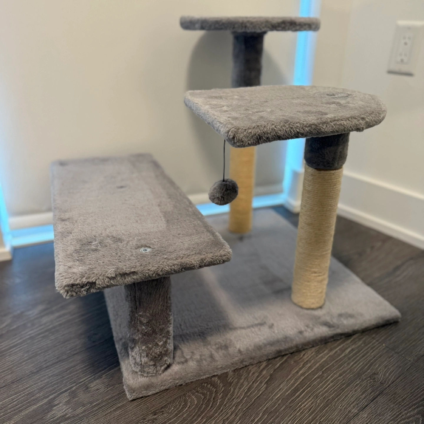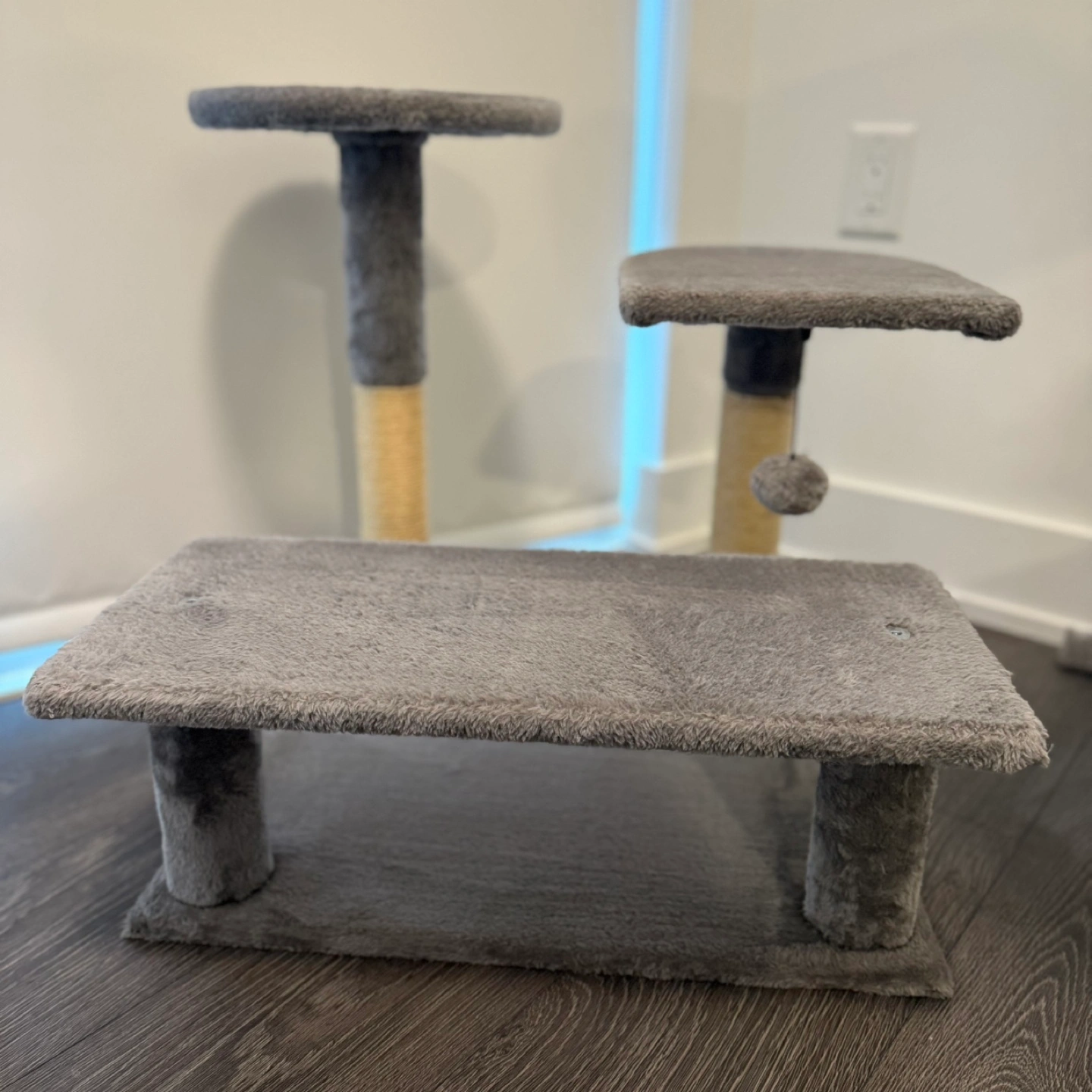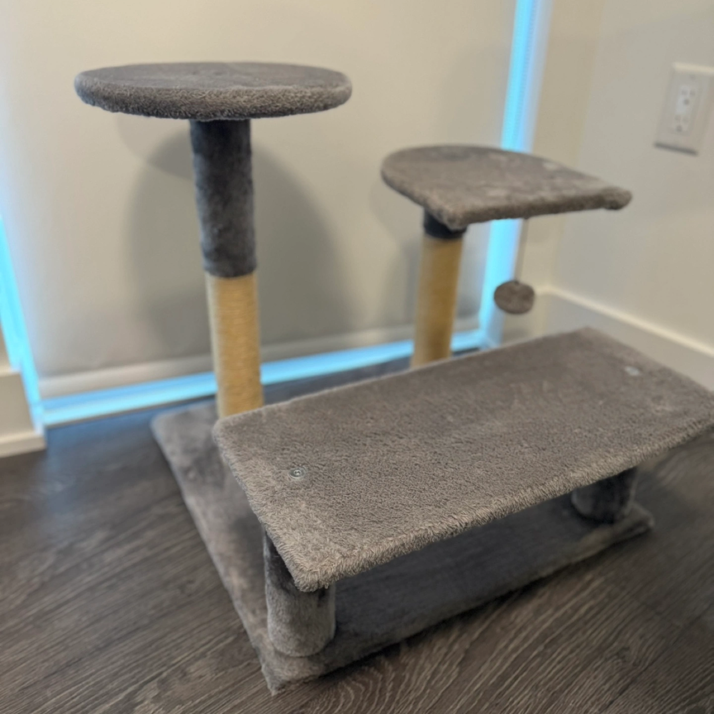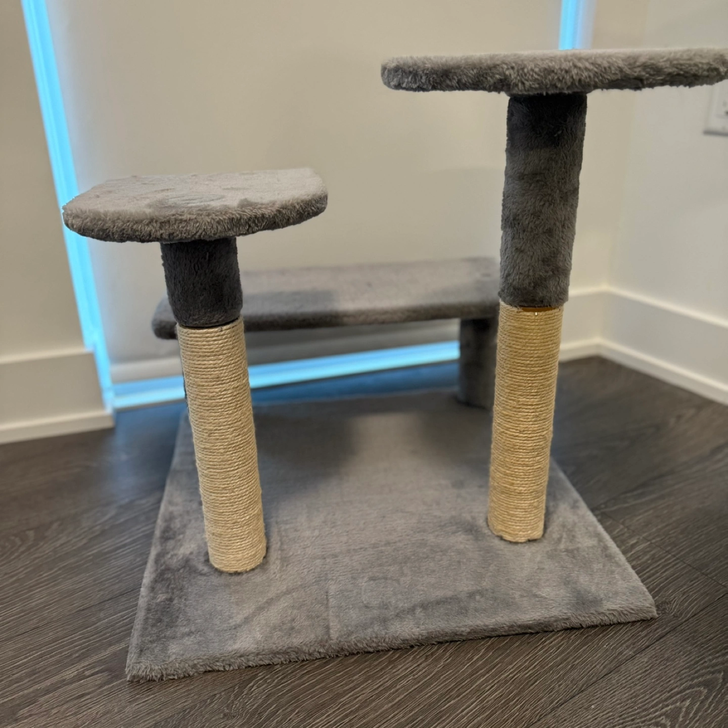 Three-tier cat tree. Features two round platforms and one rectangular platform. 21”x21” base with 21” height. The other 2 lower platforms are 9 and 15.5” high.Grey fabric covering, sisal-wrapped posts. Includes dangling toy. Good condition. *please read before reaching out* - price is fixed. Reach out only if interested. - item is first pay first serve. - pick up 5 min walk from Sherbourne Station (parliament / Bloor)