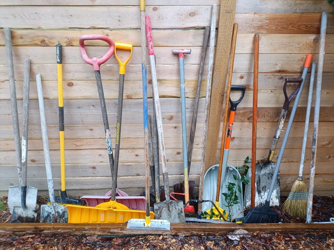 Collection of used construction tools. Includes shovels, spades, hand rakes, and more. Shows significant wear from use. Great for a contractor gardening or DIY enthusiast.
