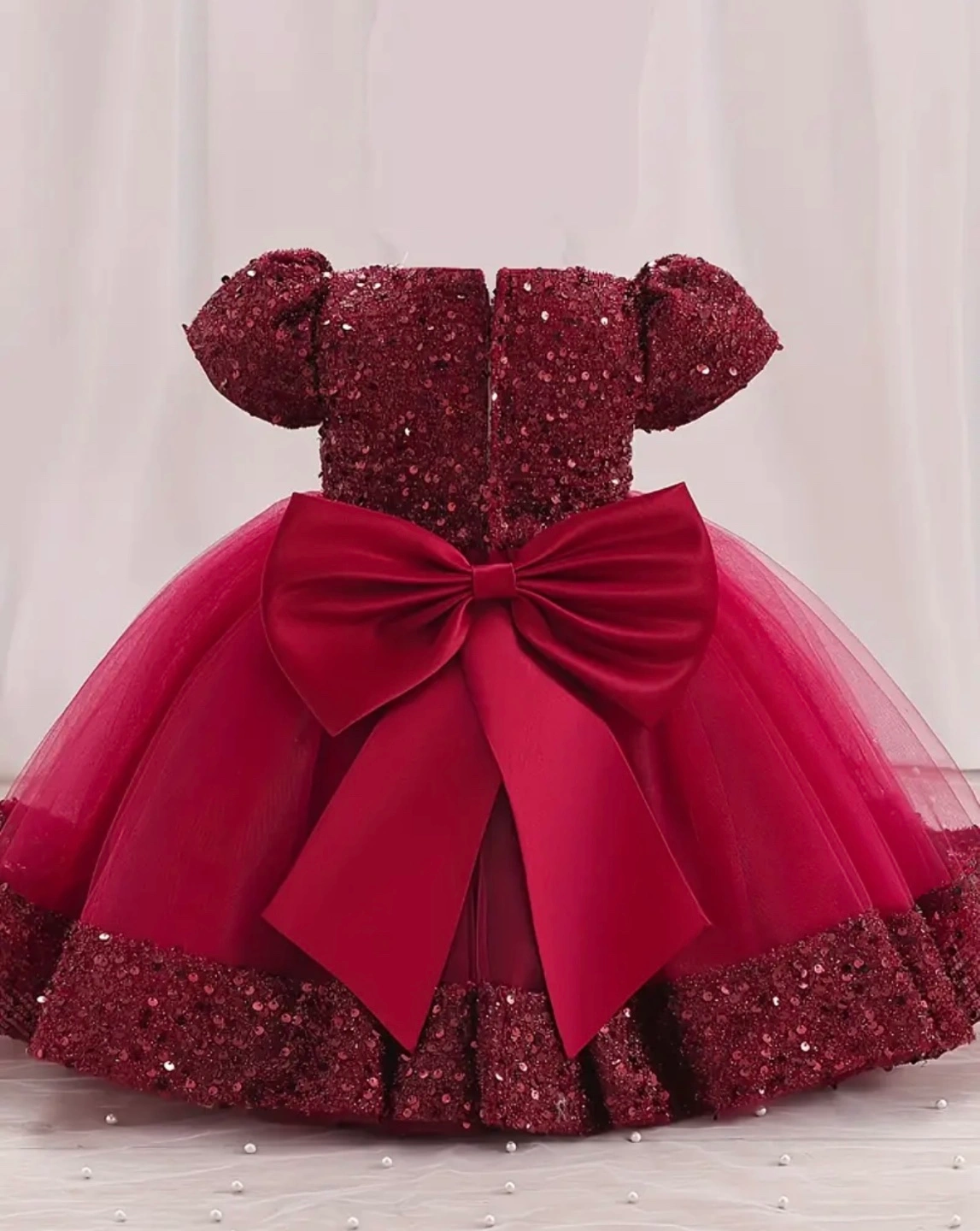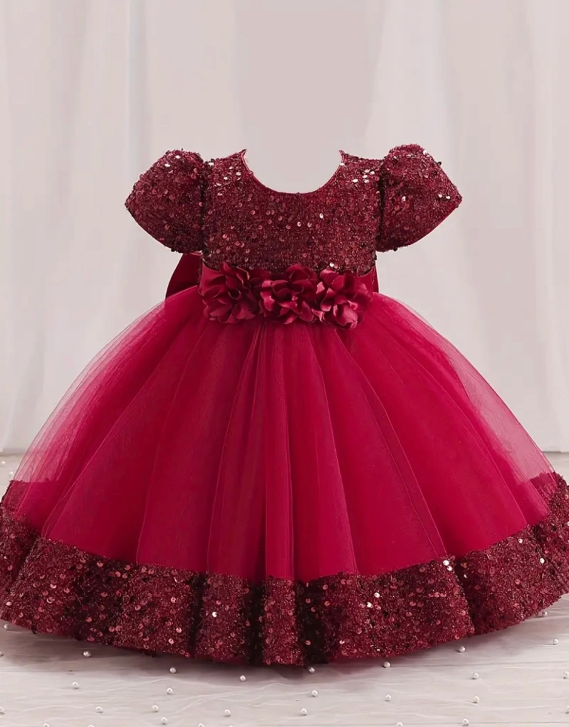 Adorable burgundy baby girl dress. Sequined bodice and hem. Big bow in the back. Perfect for special occasions. Short sleeves. Tulle skirt.
