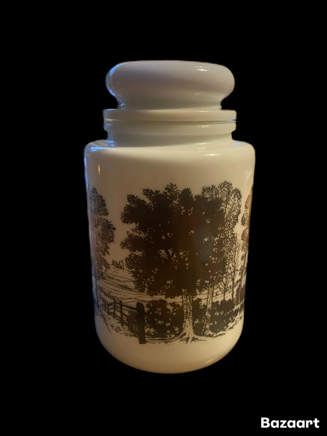 Beautiful vintage, 1960, White milk glass jar featuring a black and white countryside scene. Features a domed lid. Perfect for storage or display. Stands 7 inches tall. Great condition.