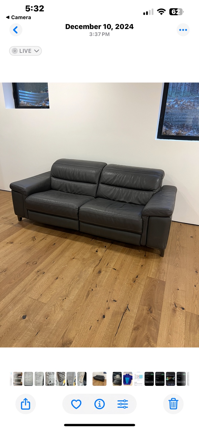 Dark grey leather couch. Three seater recliner. Excellent condition. Push button controlled