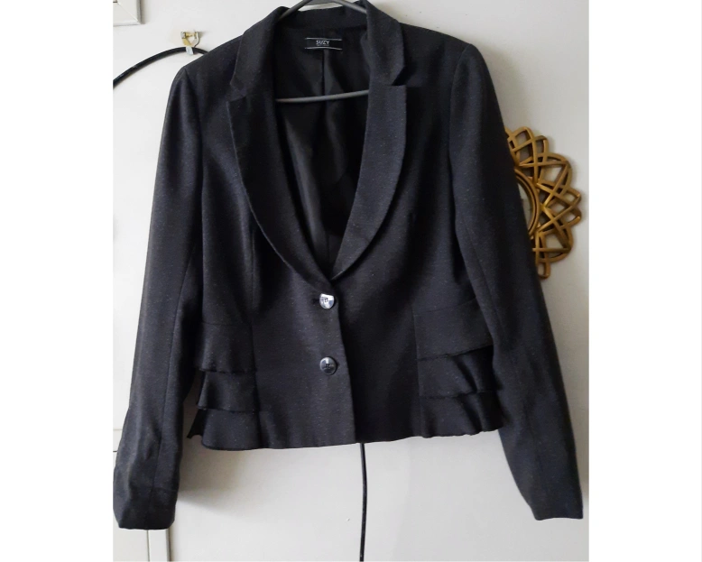 Grayish/Black women's blazer. double button closure. Ruffle detail at the hem. Long sleeves.