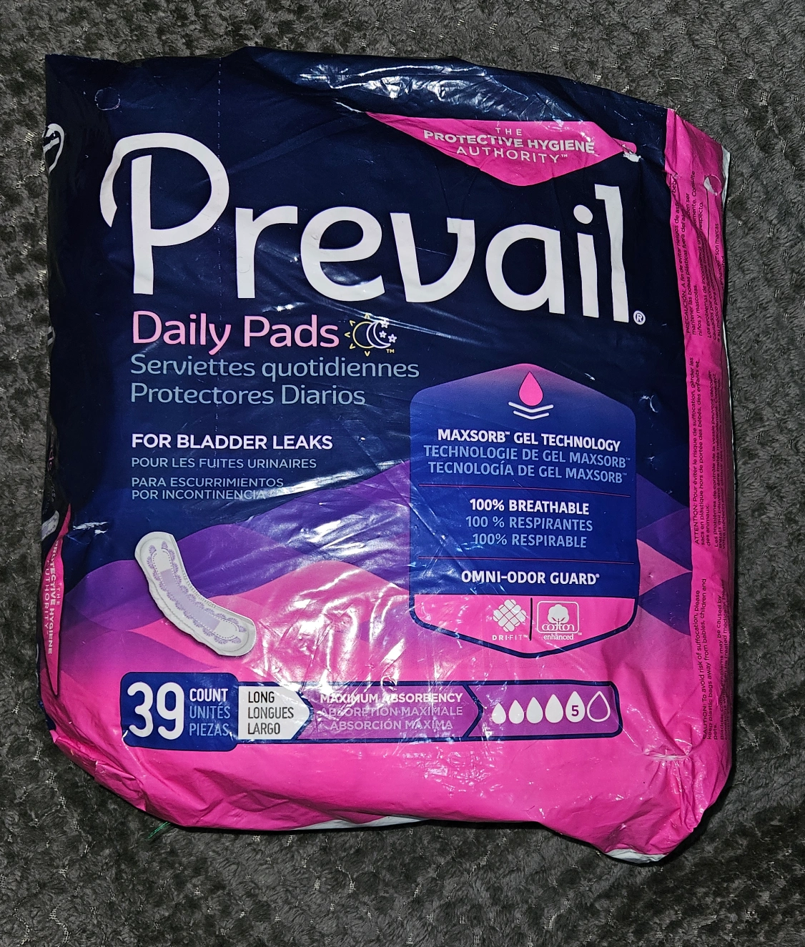 Prevail daily pads for bladder leaks. Long length, maximum absorbency. 39 count. Features Maxsorb gel technology, breathable, and omni-odor guard. unopened #Freecycle