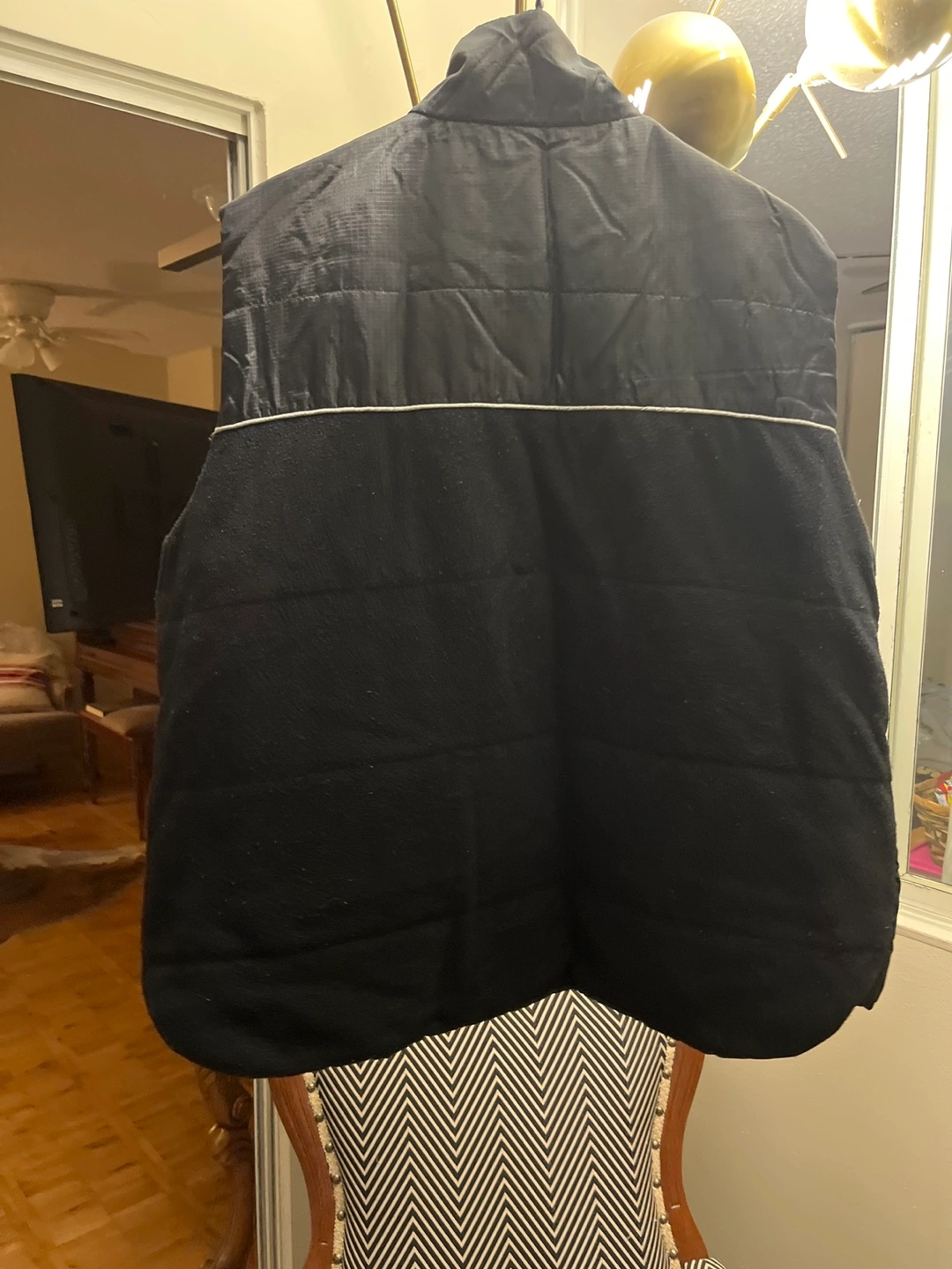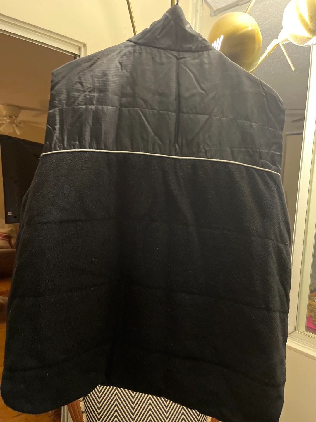 Men's black puffer vest. Features a zipper closure, two zippered pockets, and satan -lined interior. Size L/G. Great for layering.