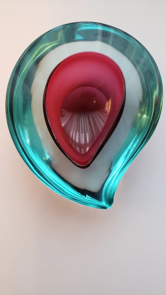Unique glass piece. Teal and cranberry colours. This decorative bowl is in a beautiful colour scheme and shape.