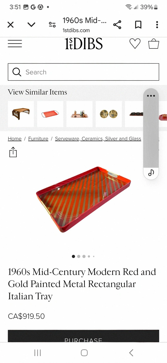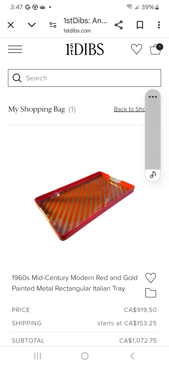 The same tray in red and gold is currently listed for sale on 1st Dibs, a New York City based online marketplace for high-end, luxury goods. Total price with shipping is over $1,000.00. See photos of red/gold tray.