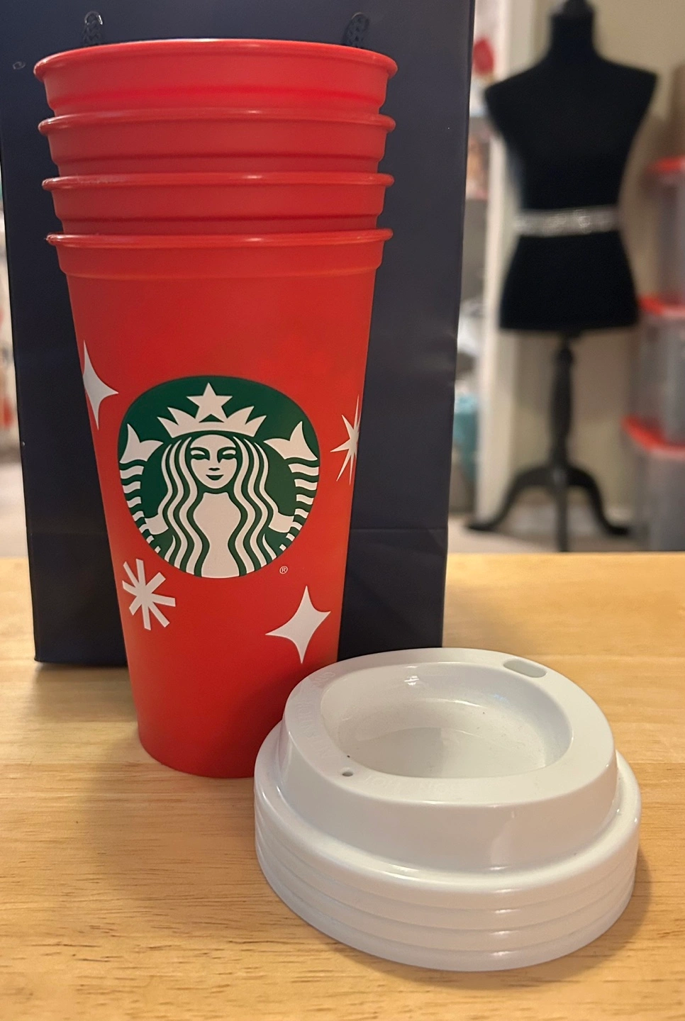 Set of four red reusable Starbucks cups. Features snowflake and sparkle design. Includes four white plastic lids. Festive holiday cups. $20 for all 😊