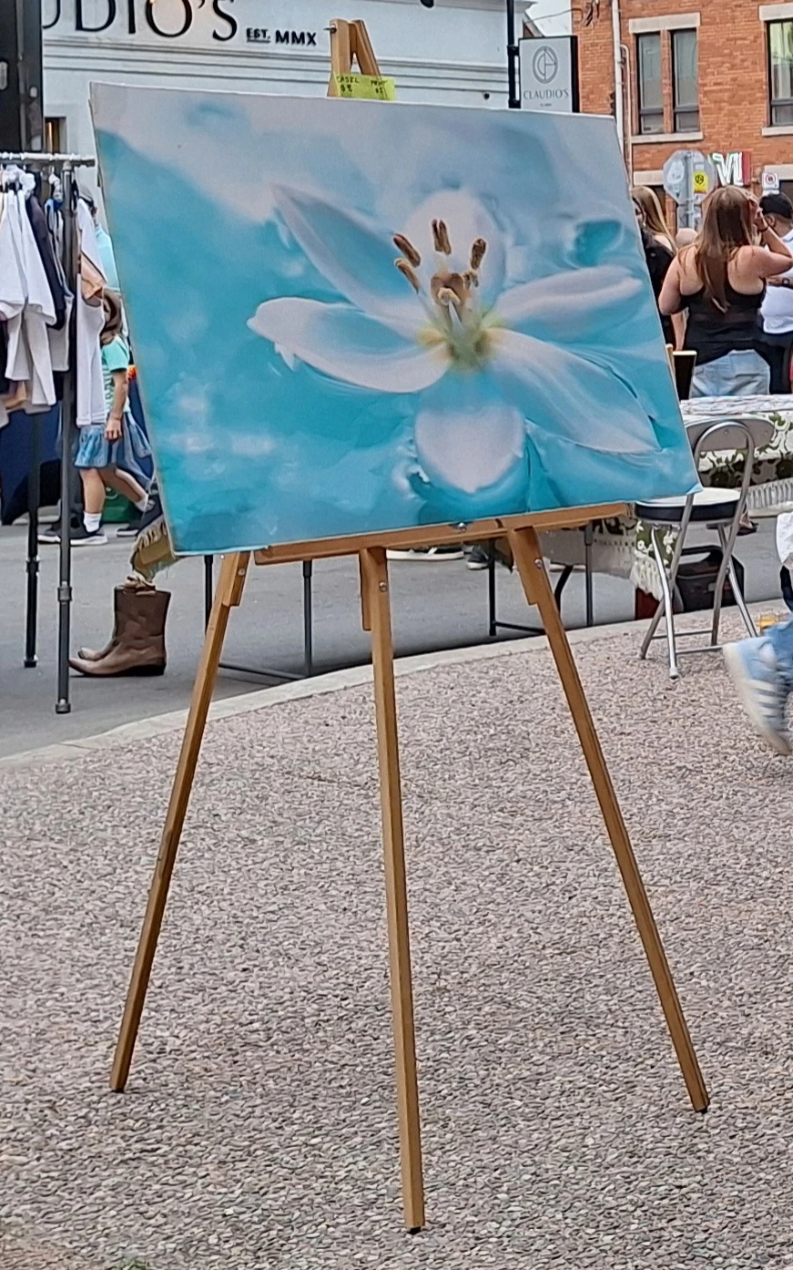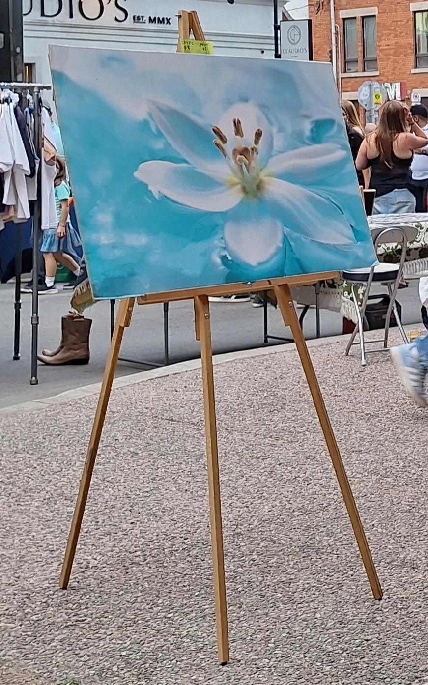 The photo with flower print has the easel set up properly.