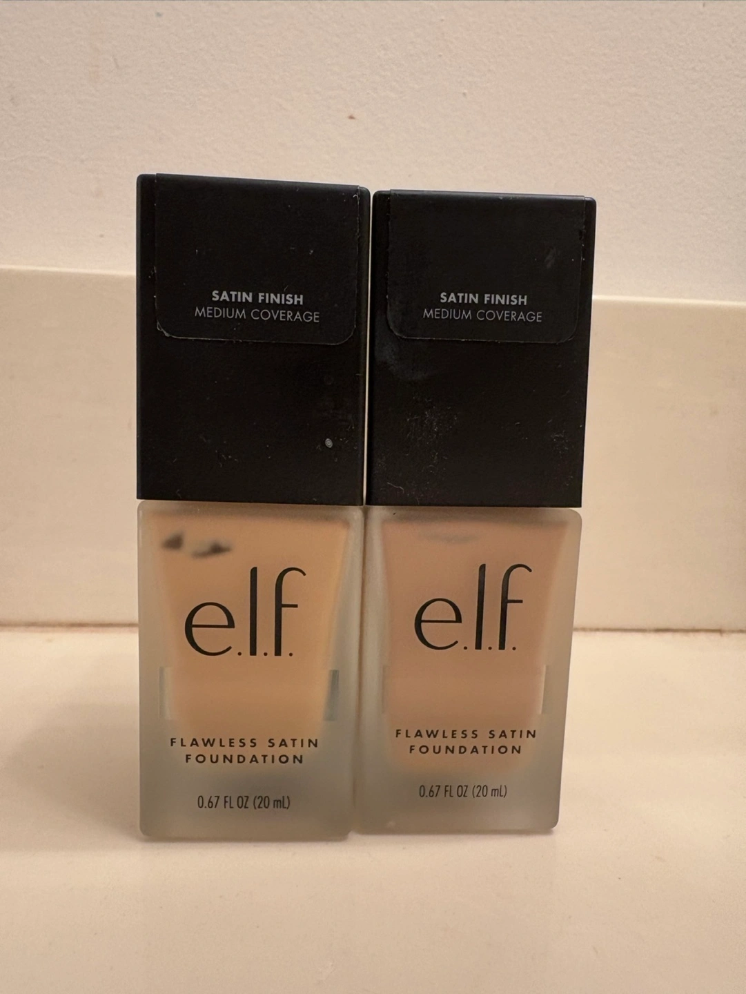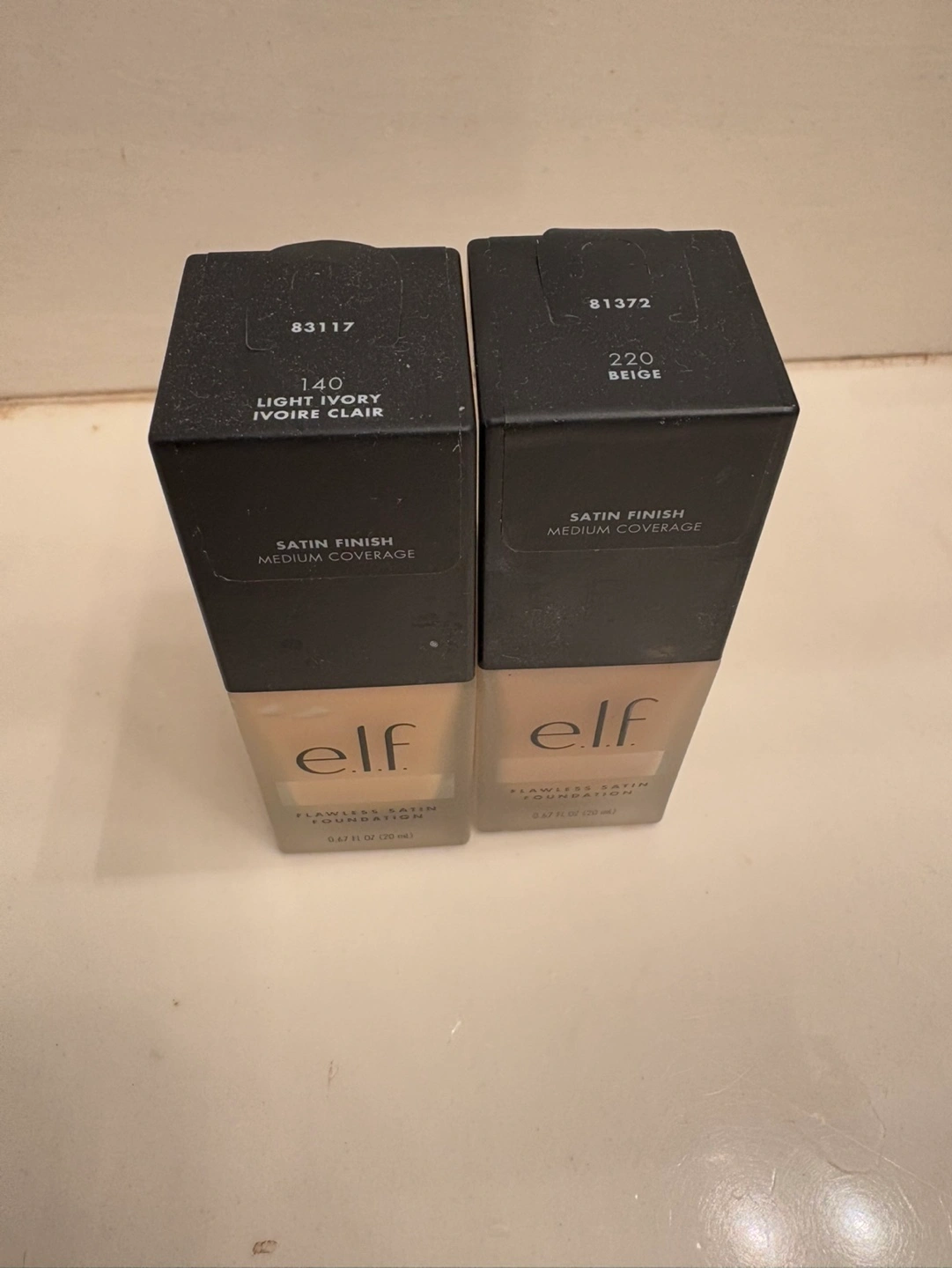 Two bottles of e.l.f. Flawless Satin Foundation. Shades 140 Light Ivory and 220 Beige. Satin finish, medium coverage. 0.67 fl oz (20 mL) each.