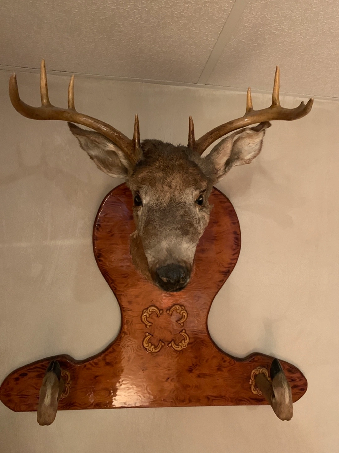 Taxidermied whitetail deer head mounted on a wooden plaque. Features decorative carvings. Includes two additional small mounts on the sides.