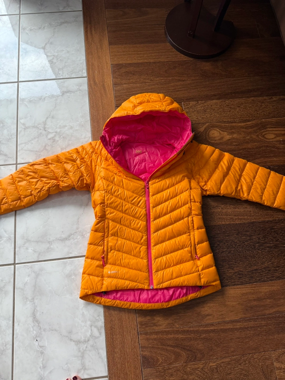 Women's size medium Heilly Hansen down jacket. Bright orange exterior, pink interior. Hood included. Lightweight and warm.