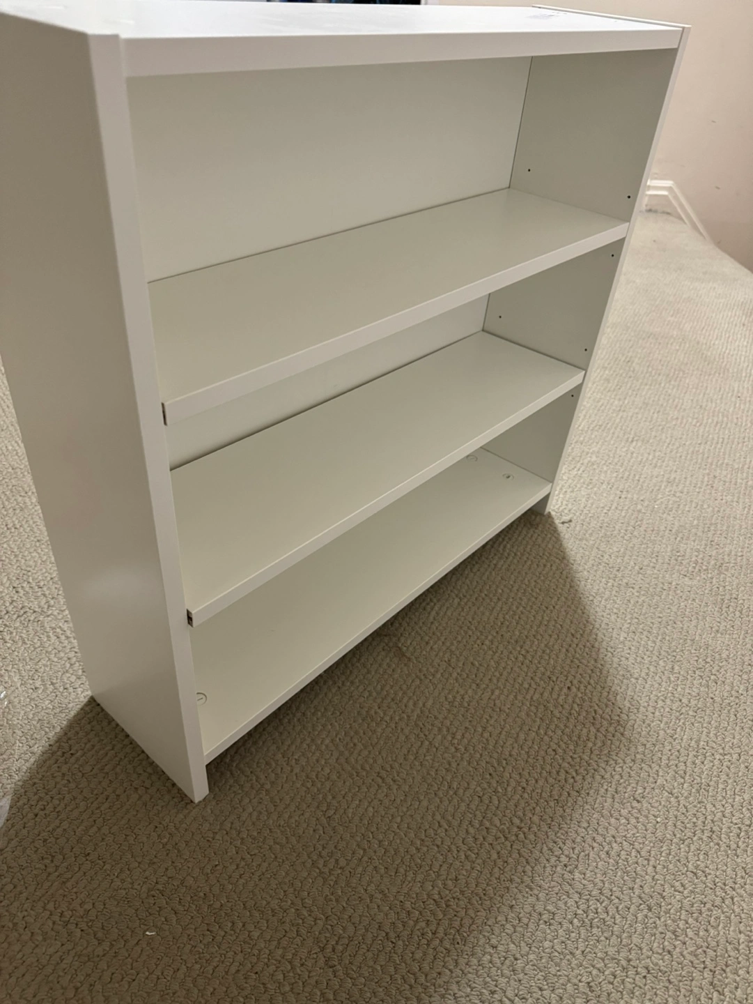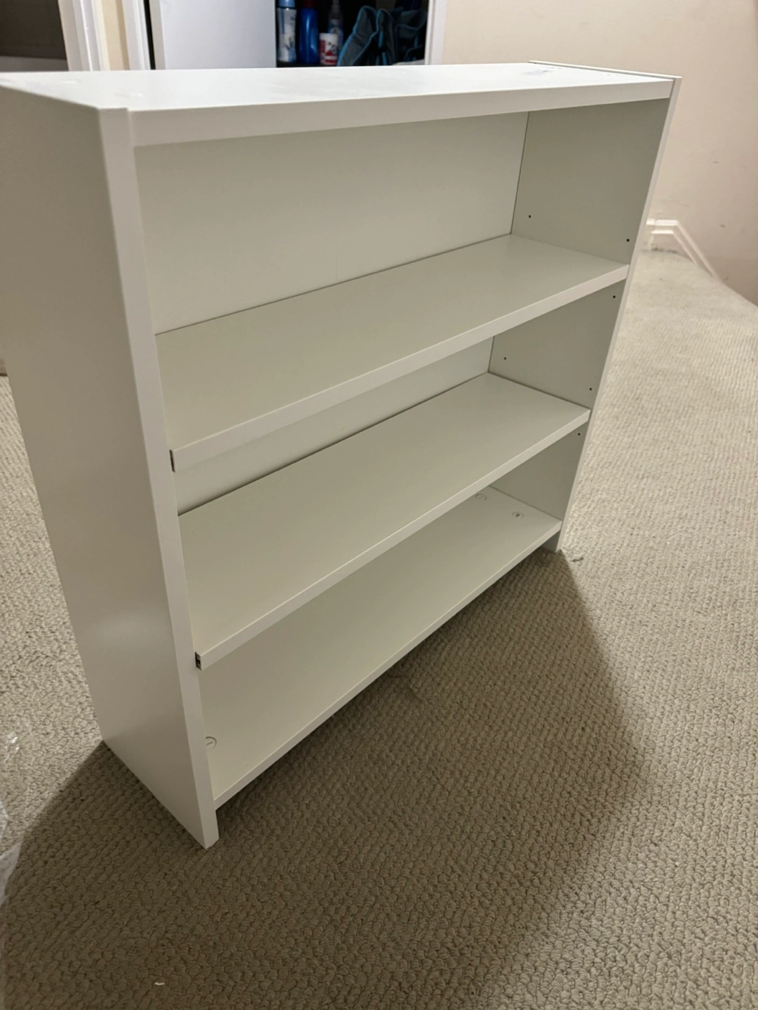 Assembled white bookcase. Three shelves. Great for organizing books or displaying items. Minimalist design. Compact size. Can be used on desk as well. Available for pickup ASAP