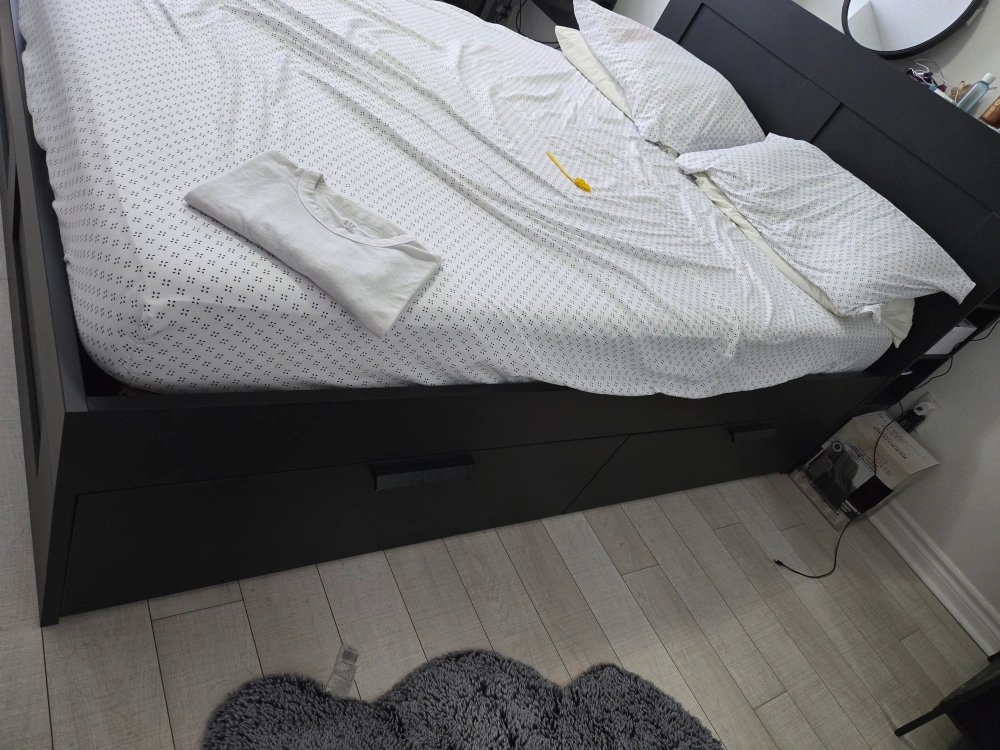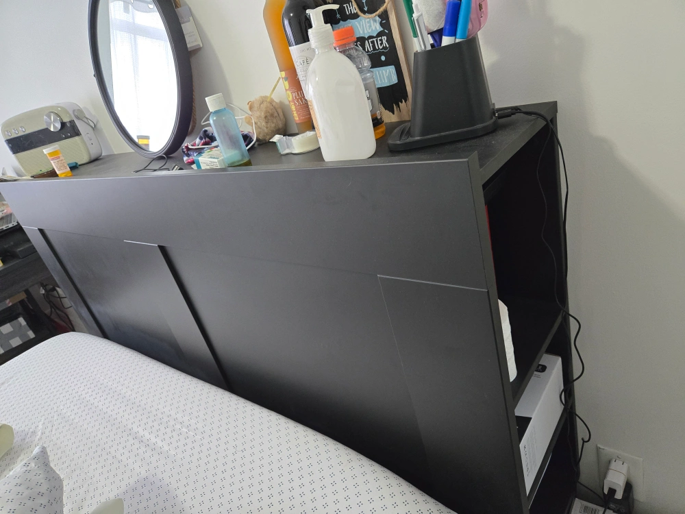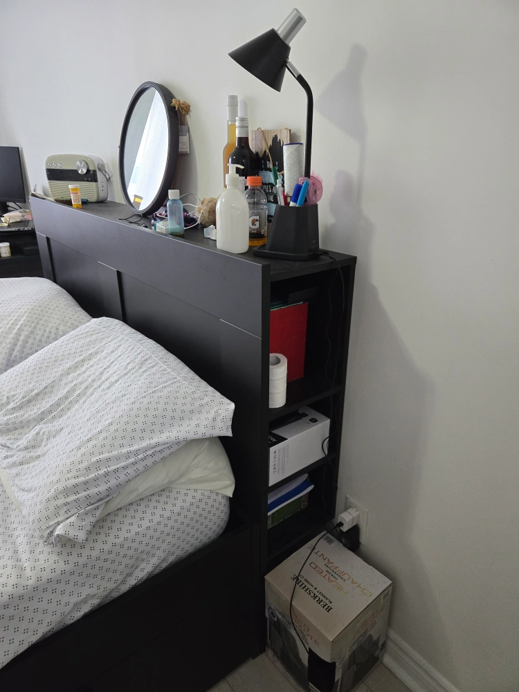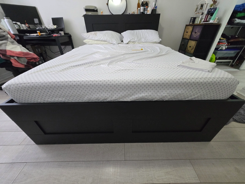 IKEA MALM bed frame. Black-brown colour. Features two large drawers for storage. Includes a built-in bookshelf headboard. Great condition.IKEA Bed frame with storage & headboard, black, Queen. A bed frame with hidden storage in several places – perfect if you live in a small space. Ample storage space is hidden neatly under the bed in 4 large drawers. Perfect for storing duvets, pillows and bed linen.