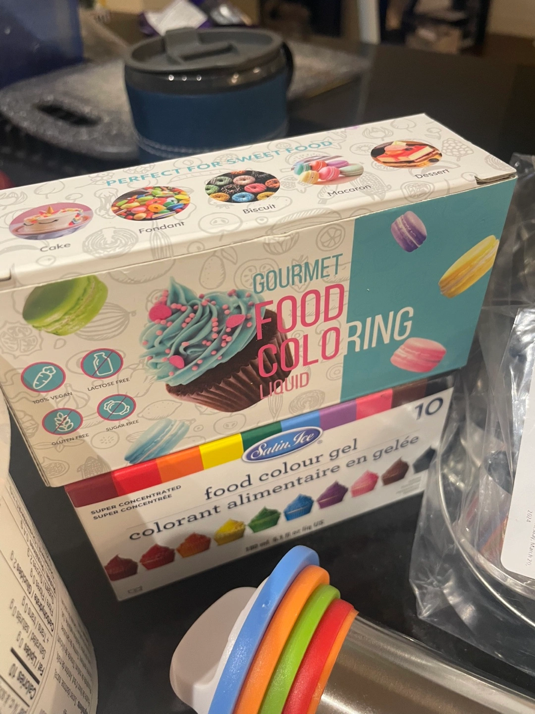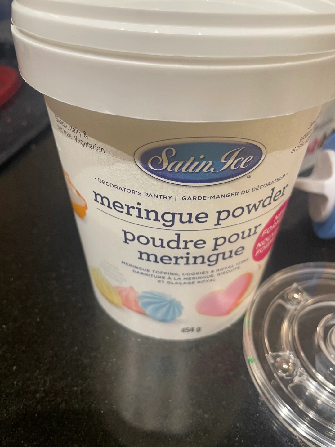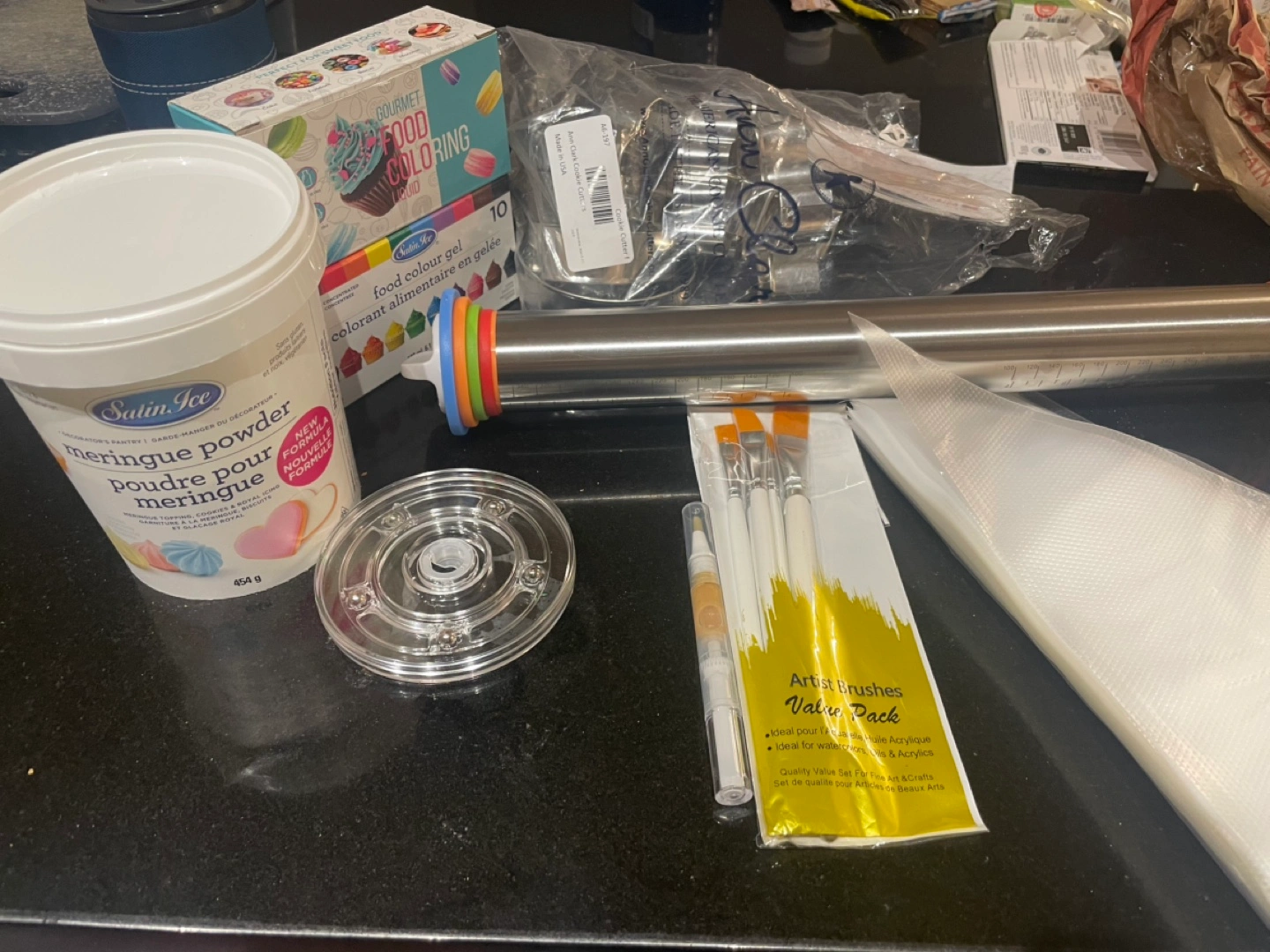 Bulk baking supplies. Includes Satin Ice meringue powder (1/2 left), food colouring gel and liquid (lightly used), assorted metal cookie cutters, rolling pin with cookie thickness guides, disposable piping bags, decorating brushes.