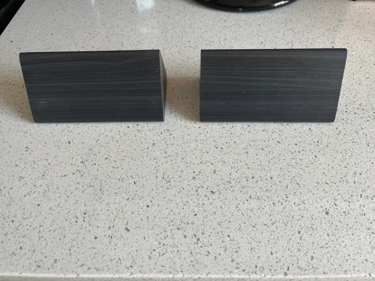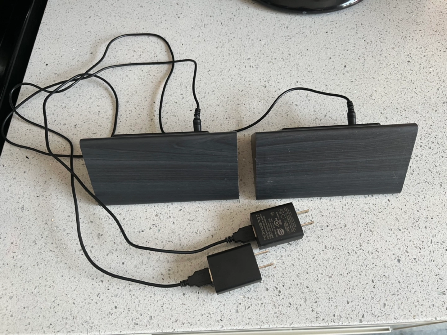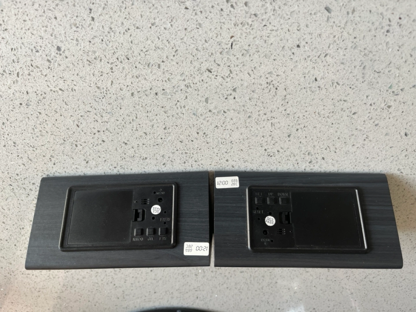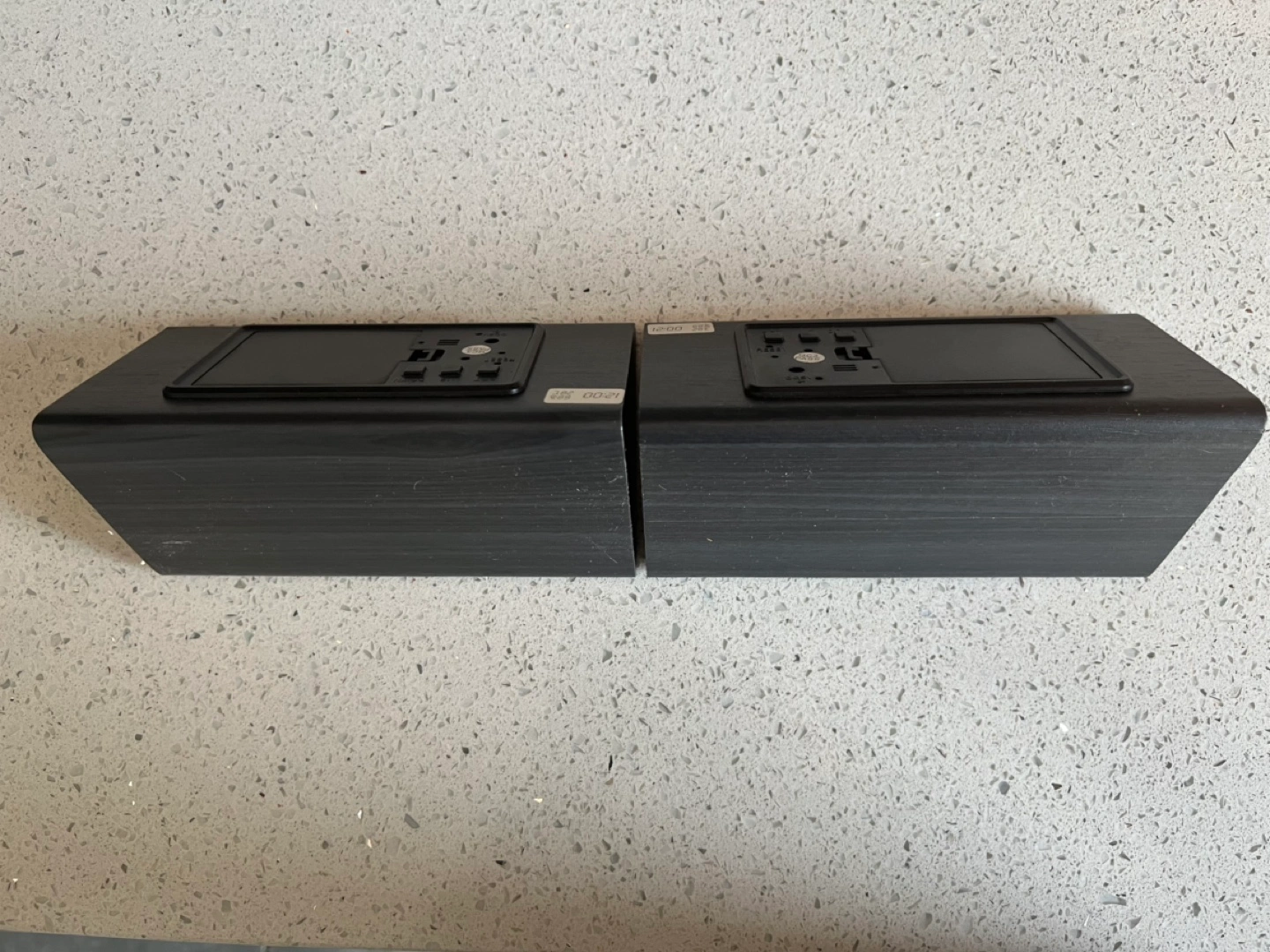 Faux wood grain finish. Two black digital alarm clocks. Modern design, wood grain finish. Displays time, temperature, and humidity. Battery operated. Includes power cords. Minimalist style.