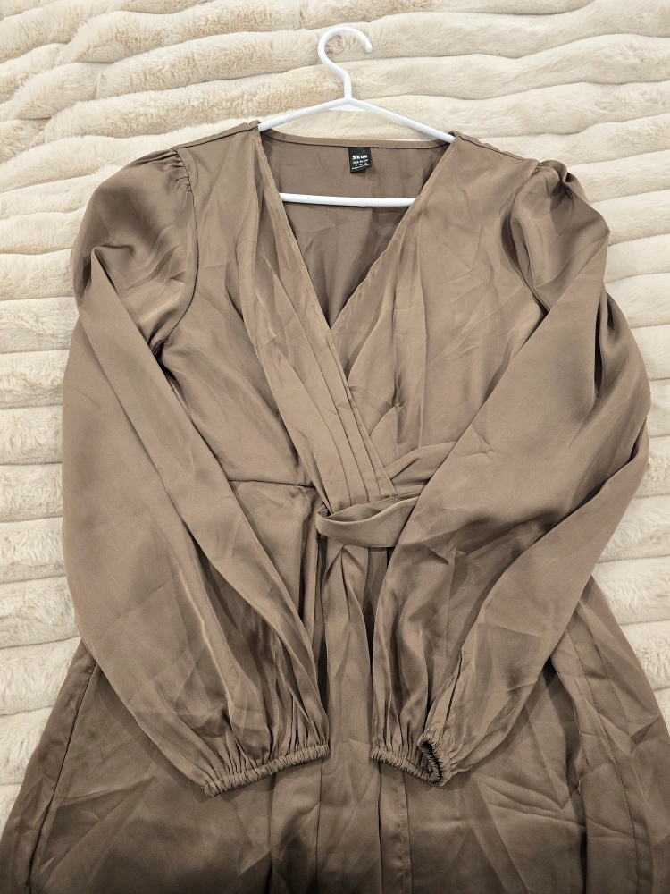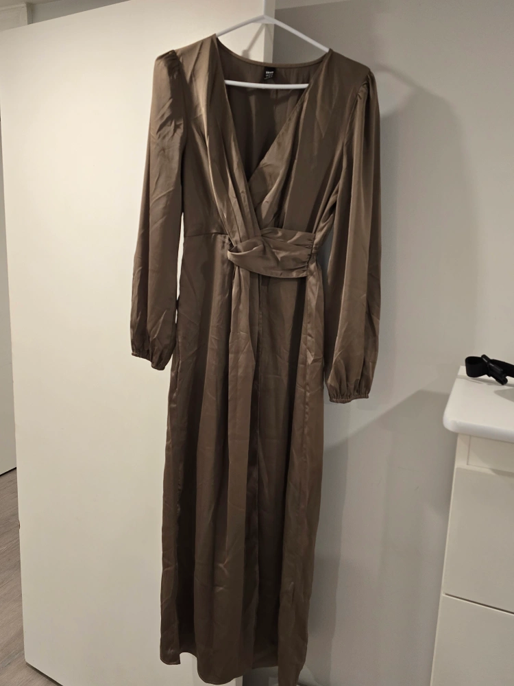 Gorgeous brown satin maxi dress. Long sleeves, wrap style, and cinched waist. Perfect for a special occasion.