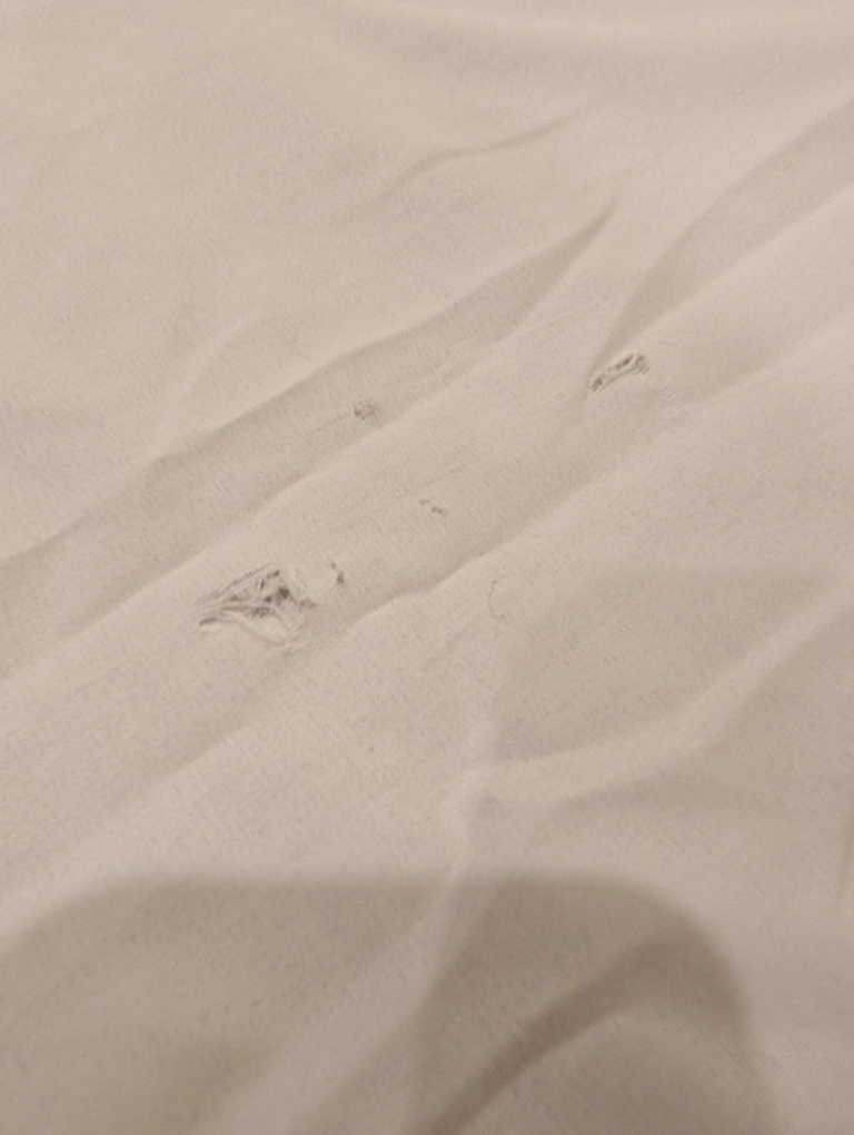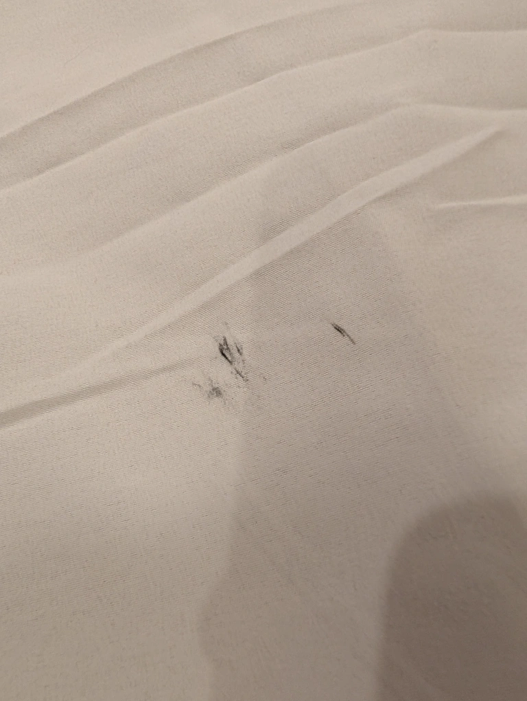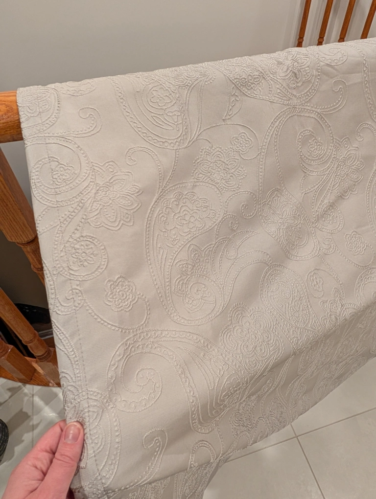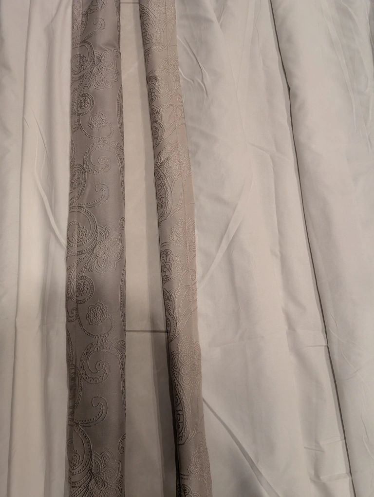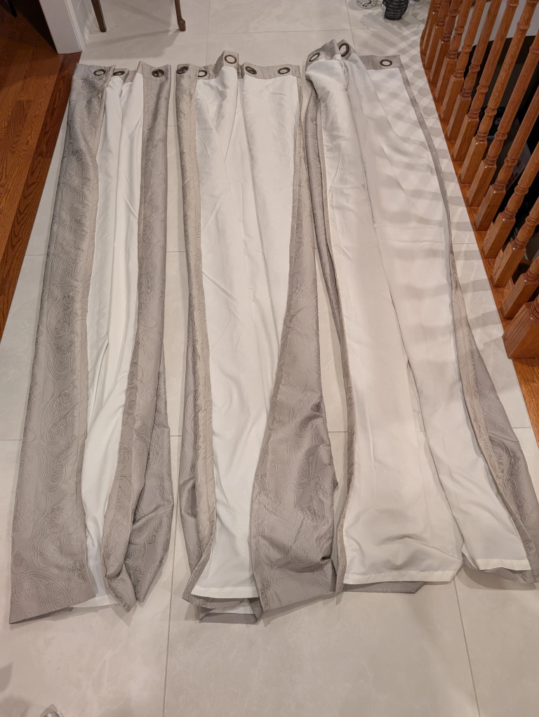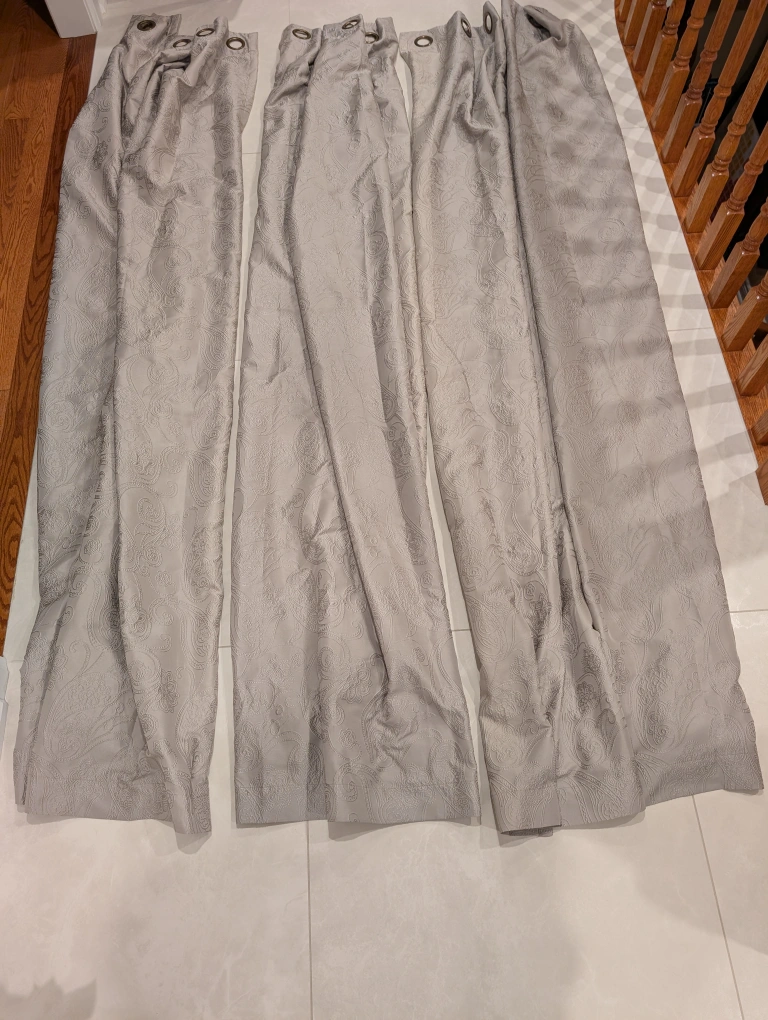 There are 3 grey curtain panels with desings on them. One panel has small rips and stains as seen in the photo. The ends of each curtain panel is getting lighter with the sun, which I tried to show in the pictures.