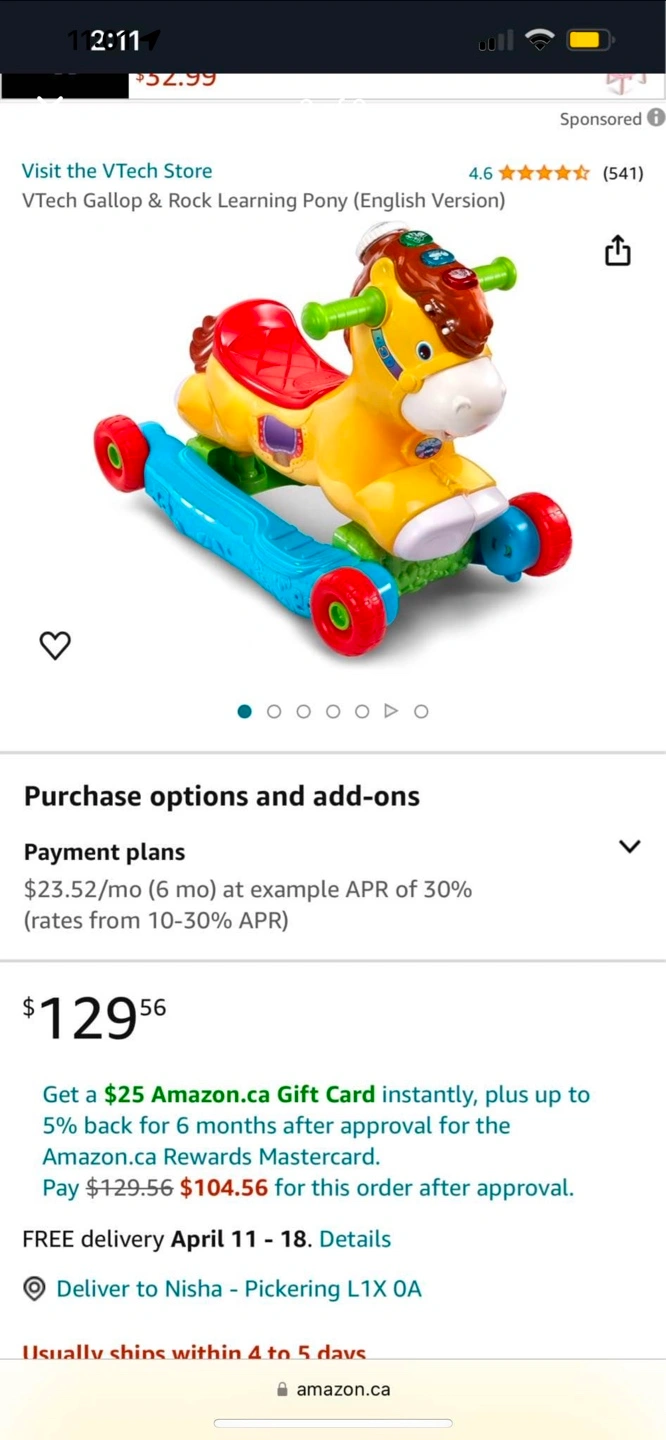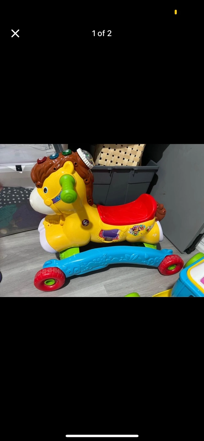 Pre-loved VTech Gallop & Rock Learning Pony. Yellow and red rocking horse toy. Features lights and sounds. Suitable for toddlers.